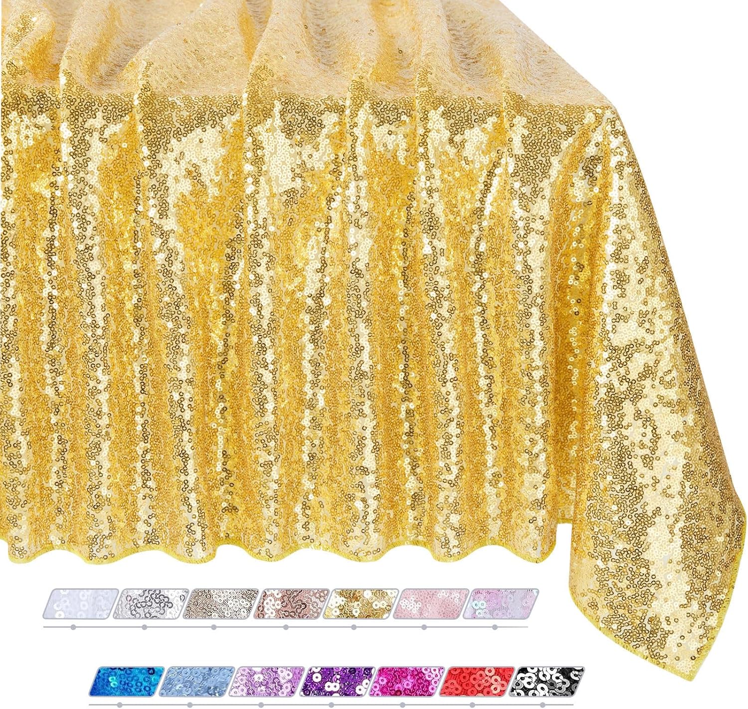 • Gold Sequin Tablecloth Size: 1 packs of Gold sequin tablecloth, the size of the Gold tablecloth is 50 W by 80 ​L inch. It's long enough to fit any round, rectangle or square table.