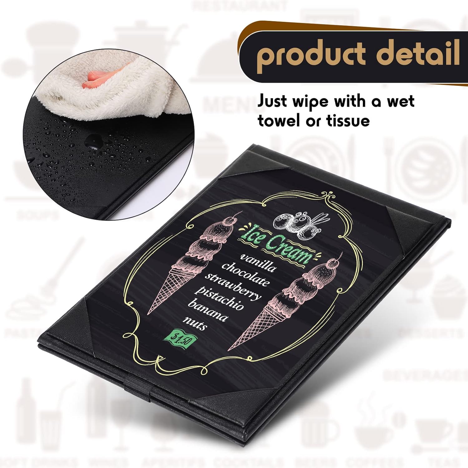• Double Sided Foldable Design: each table tent comes with two viewing sides, helps you to feature twice the content for saving space; With the ribbon, both panels connected and supported while in use; Menu cover can be folded when no use for easy storage