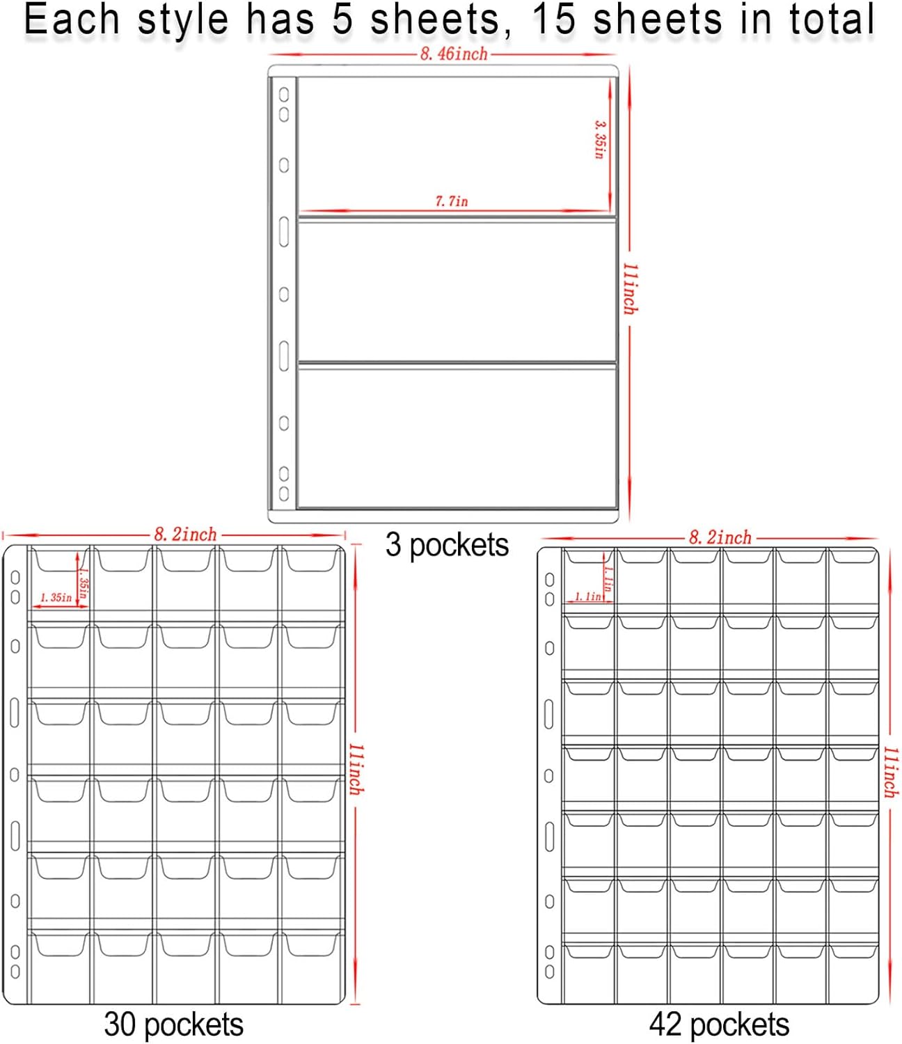 • 375 Pockets Coin Collection album: Size(13'' x 10.5'' x 2.5''). Includes three pocket styles(Each pocket style has 5 sheets): 1.1'' x 1.1'' (42 pockets each page), 1.35'' x 1.35'' (30 pockets each page) and 7.7'' x 3.35'' (3 pockets each page)