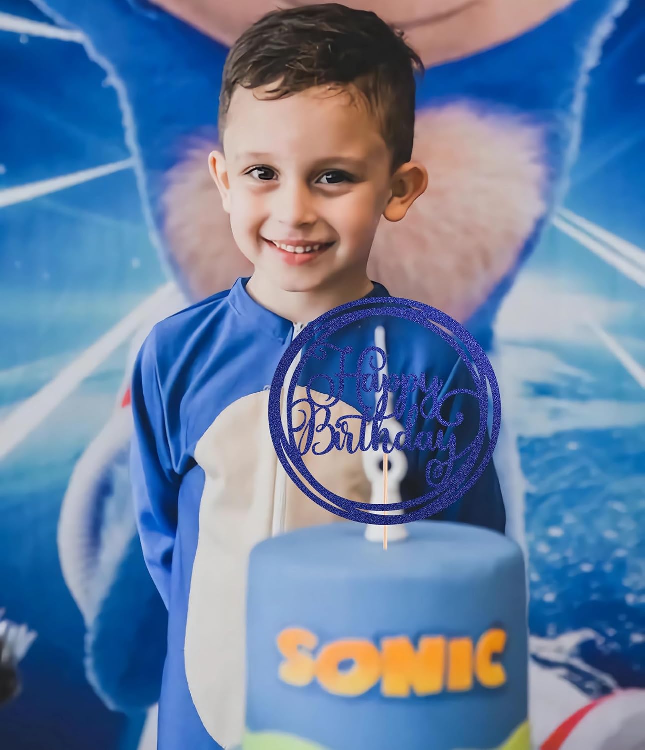 Happy Birthday Cake Topper - Blue Glitter Happy Birthday Cake Decoration Supplies for Children or Adults - Happy Birthday Cake Bunting Decor, Photo Booth Props