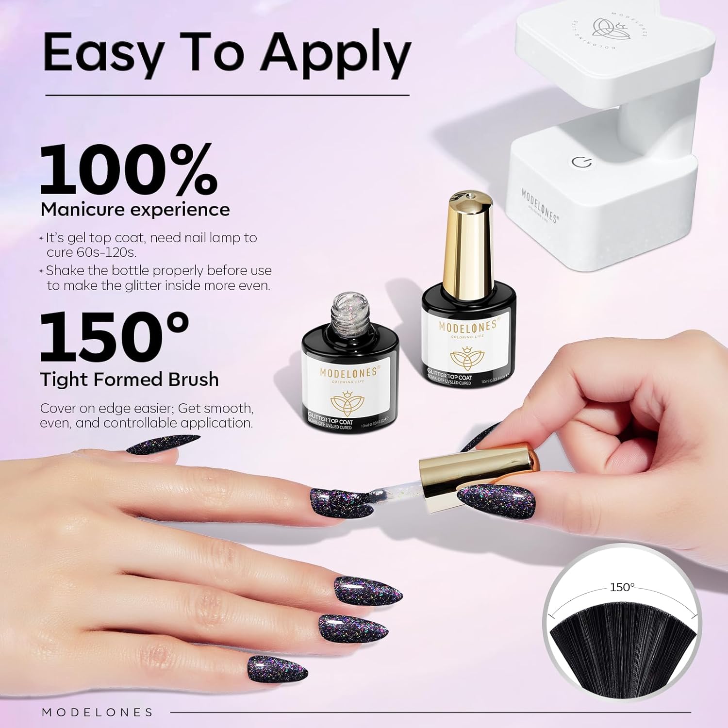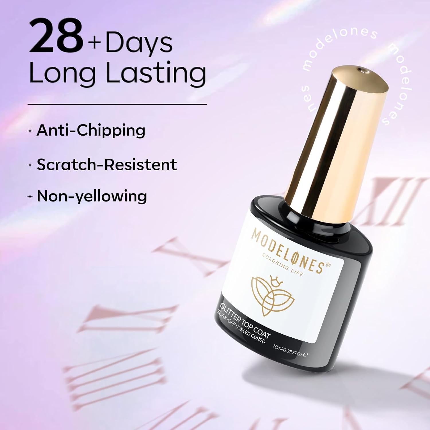 • Playful Glitter Top Coat: Modelones 2024 upgrade translucent top coat gel with sprinkled sequins glitter; Adds a vibrant mix of confetti-like glitter to your nails to achieve a festive and fun look, perfect for celebrations or adding a pop of color