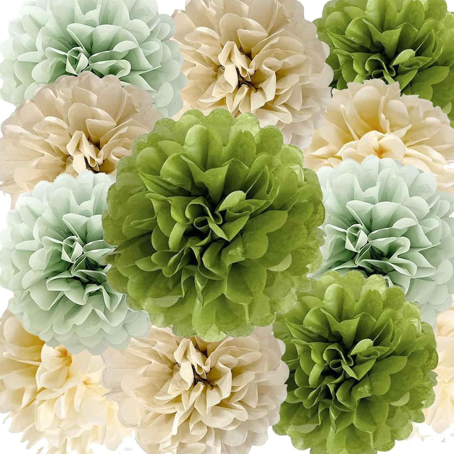 We Moment Olive Sage Green Cream Ivory Tan Tissue Paper Pom Poms Party Decorations for Neutral Baby Shower Boho Wedding Birthday Wild Safari Greenery Party Décor 12pcs 4 Colors