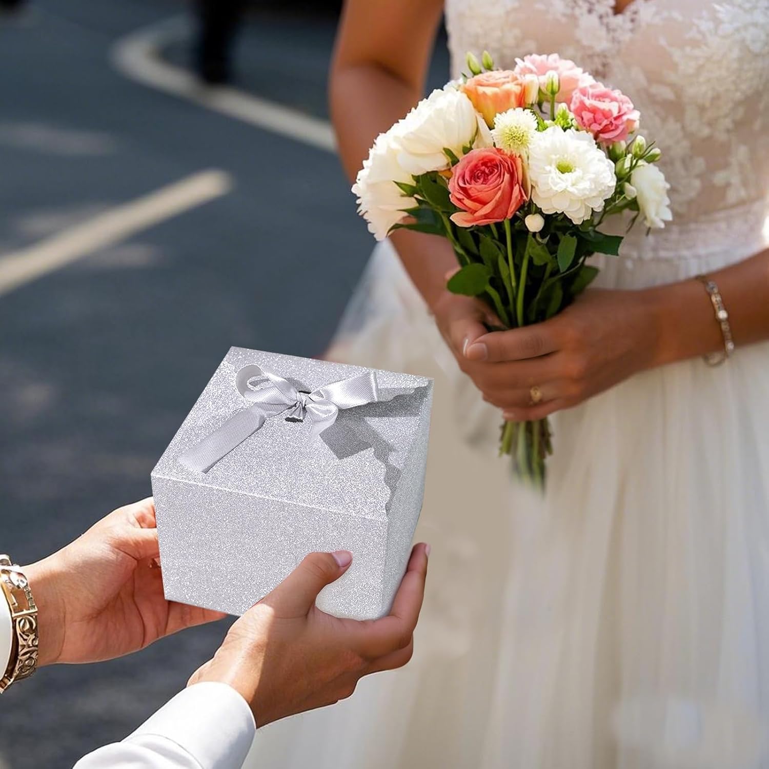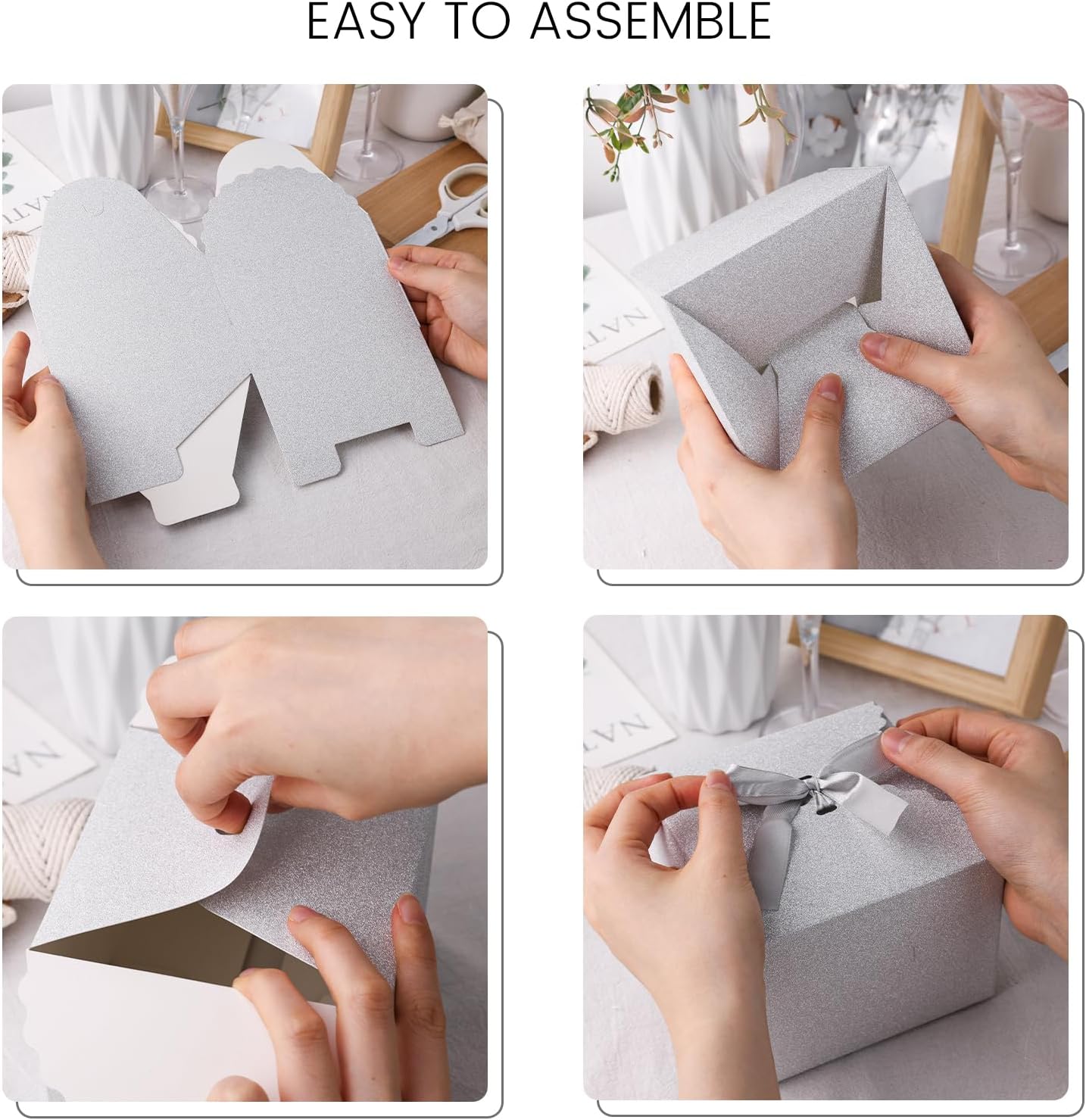 • Package Includes: You will get 10 sliver glitter folding boxes made from high-quality paper, along with 10 ribbons. Each box measures 4.7" x 4.7" x 3.5"
