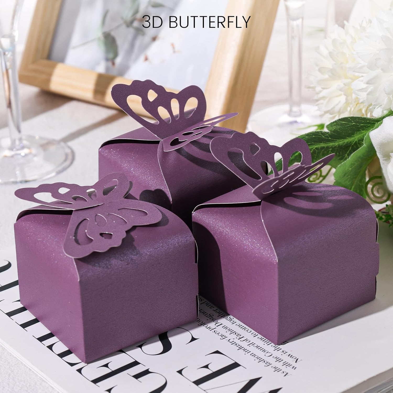 • Package Includes - 50PCS purple butterfly favor boxes. Size is approx 2.4" x 2.4" x 1.8", height is not including the butterfly.
