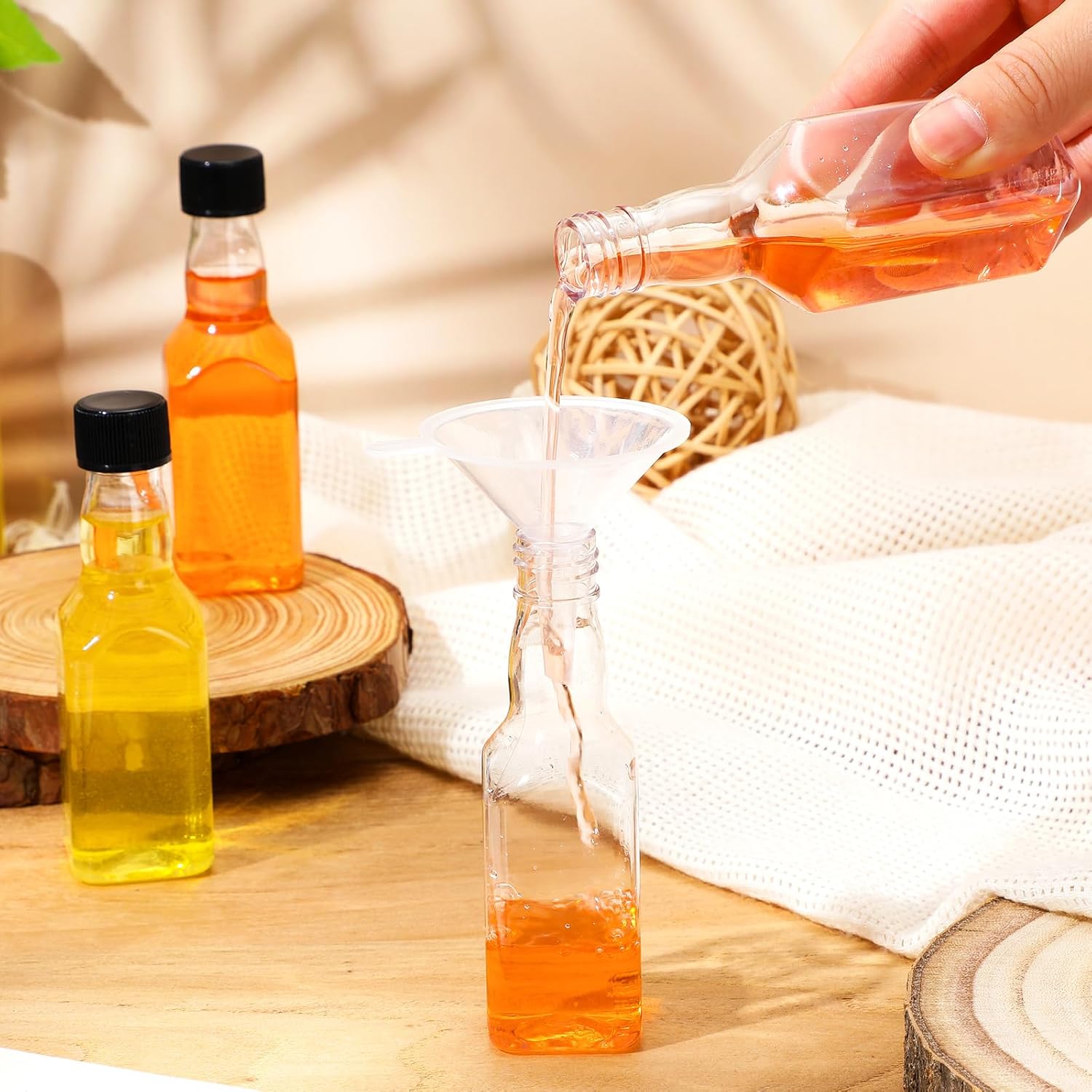• Proper Size for Portability: the alcohol mini liquor bottles stand approx. 4.1 inches/ 10.5 cm in height, and have a bottom diameter of about 1.2 inches/ 3.1 cm; With a capacity of about 1.7 oz/ 50 ml and funnels sizing around 2.3 x 2.1 inches/ 5.8 x 5.4 cm, these containers are compact, and they won't take up much space