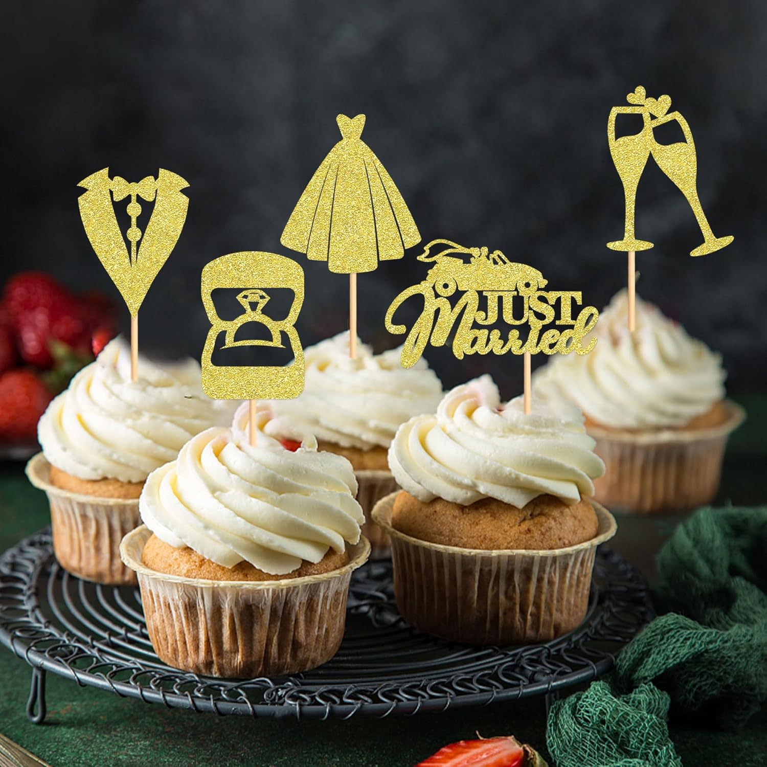 25 Pcs Bride and Groom Cupcake Toppers Wedding Dress Diamond Ring Cupcake Picks Bridal Shower Wedding Engagement Anniversary Party Cake Decorations Supplies golden