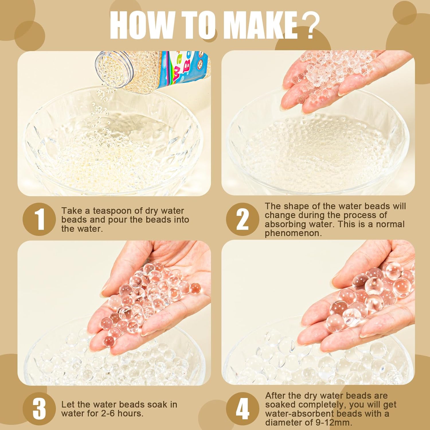 • Easy to Use: Take out the dry water gel beads from the packaging bag and soak them in water for 1-3 hours, and you will get the fully expanded water beads!