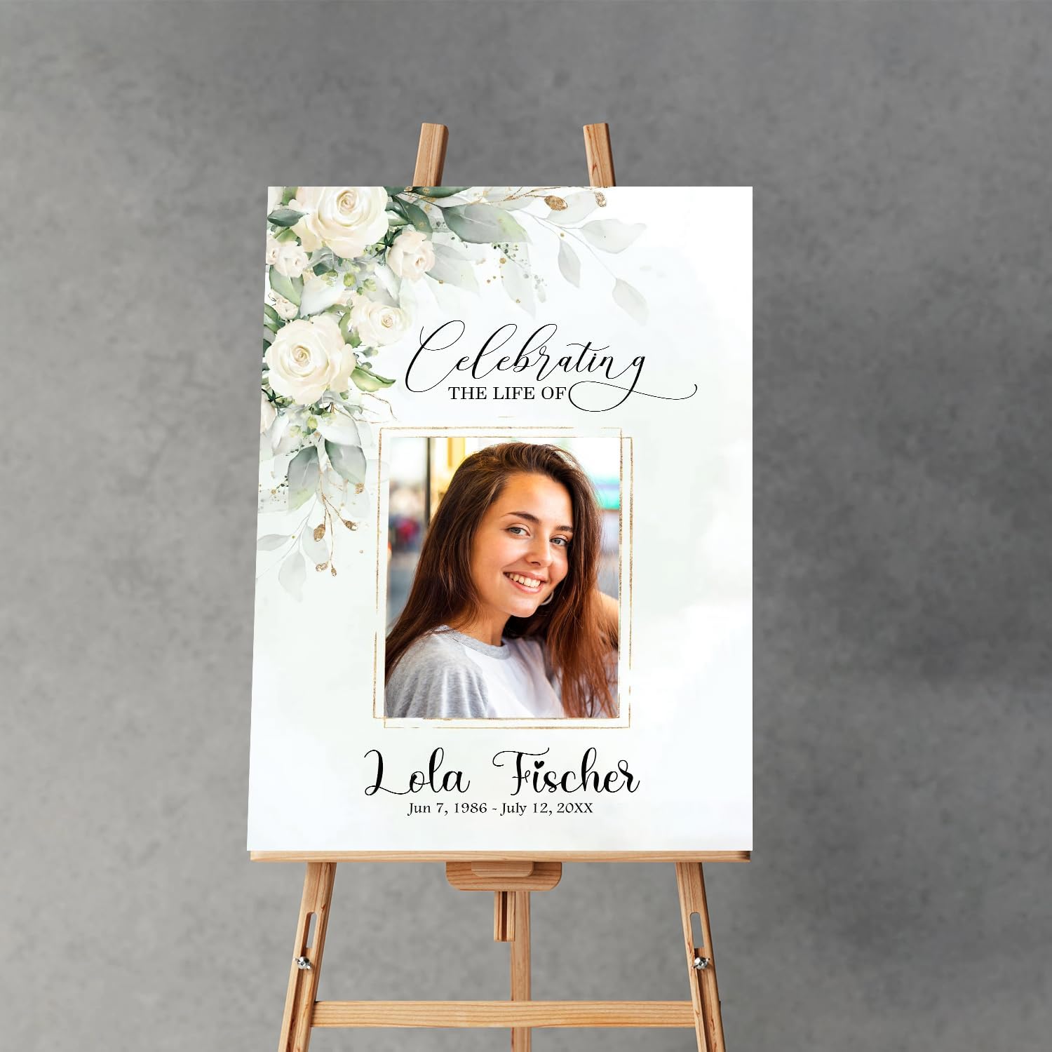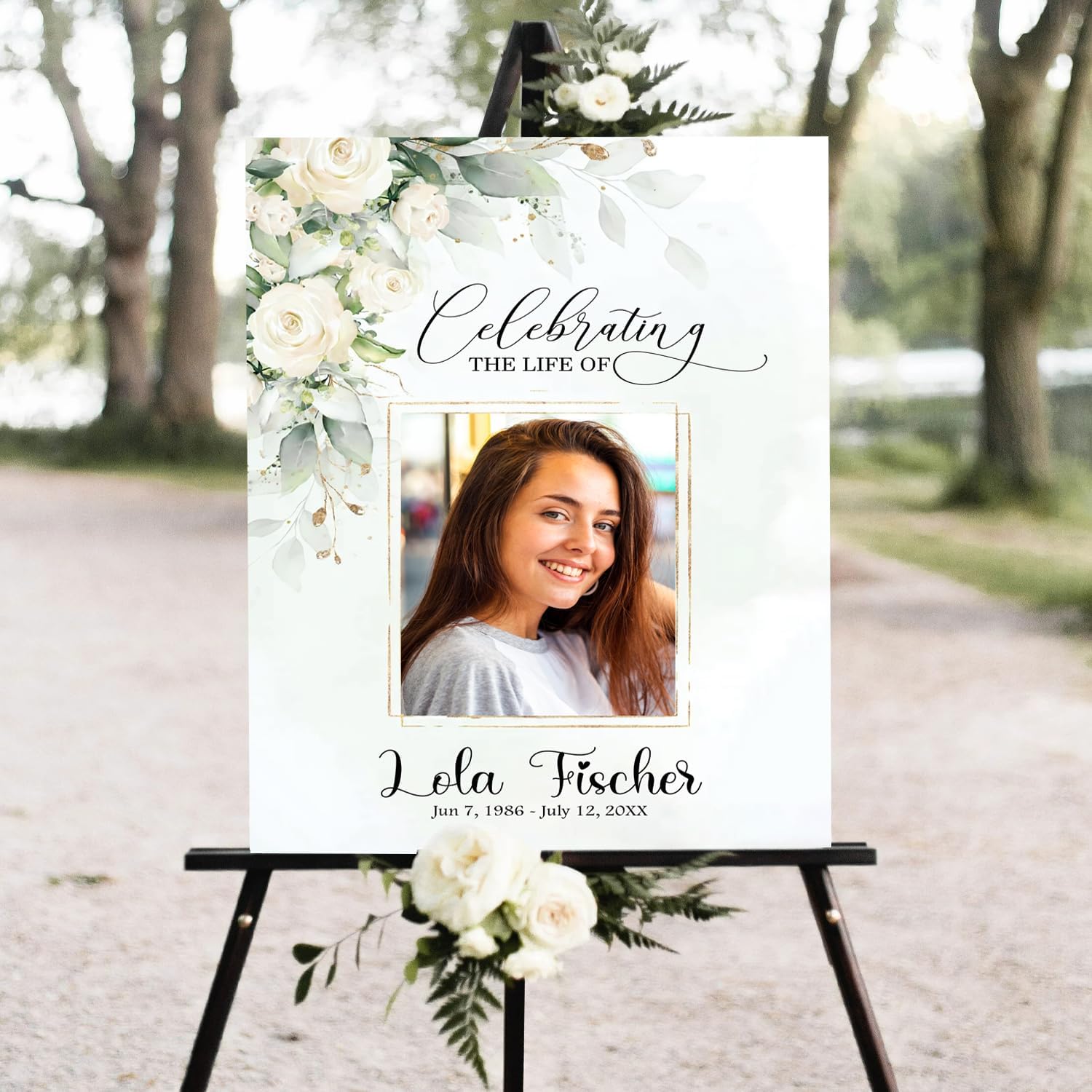 Funeral Welcome Sign with Photo, White Greenery Funeral Welcome Sign, Celebration of Life Decoration, Funeral Memorial Sign, In Loving Memory Sign, Photo Sign, Funeral program