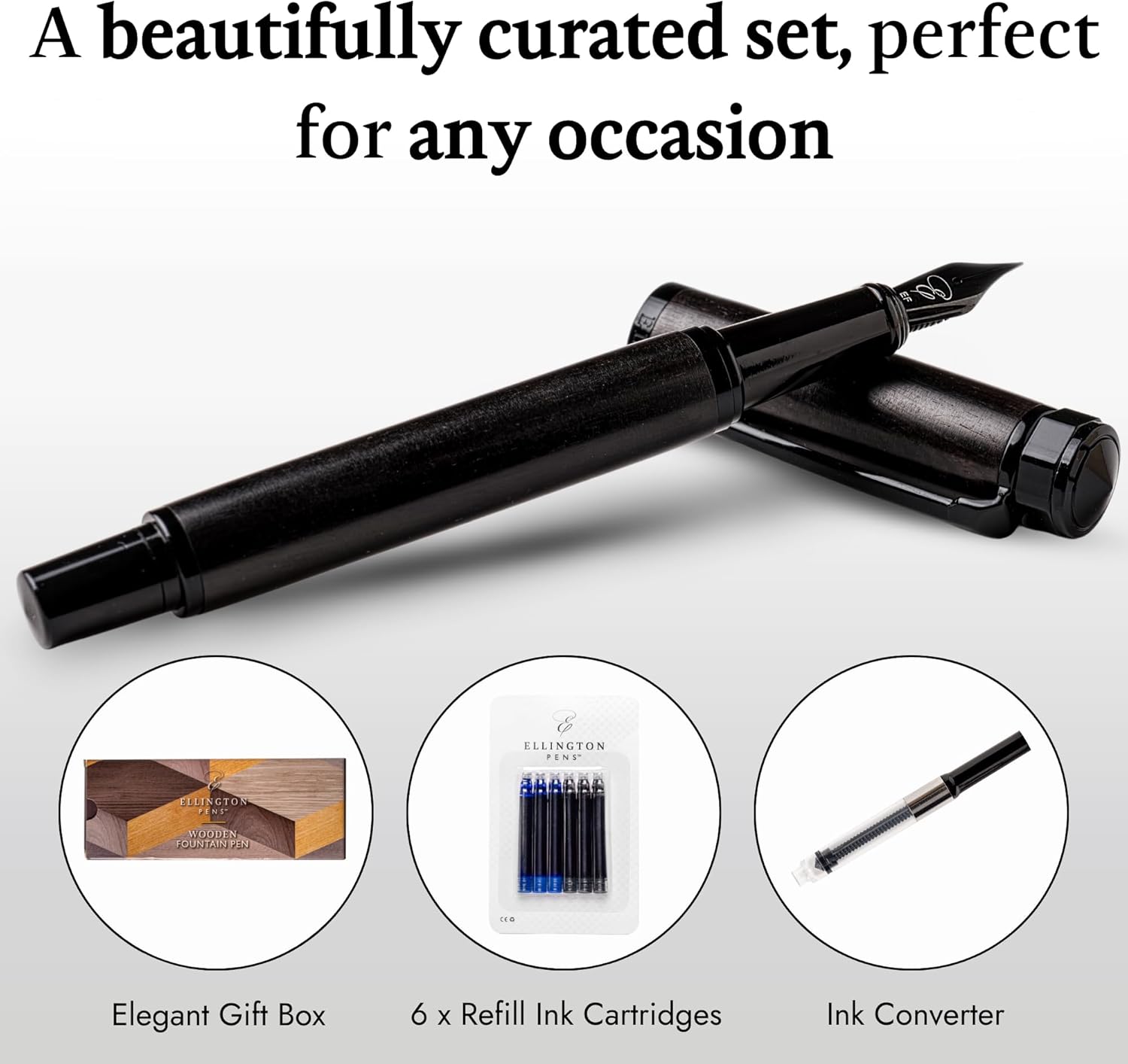 Ellington Pens Elegant Wood Fountain Pen Set – Includes Wooden Pen Box, Ink Converter, 6 Ink Cartridges, and Gift Box – Writing, Calligraphy