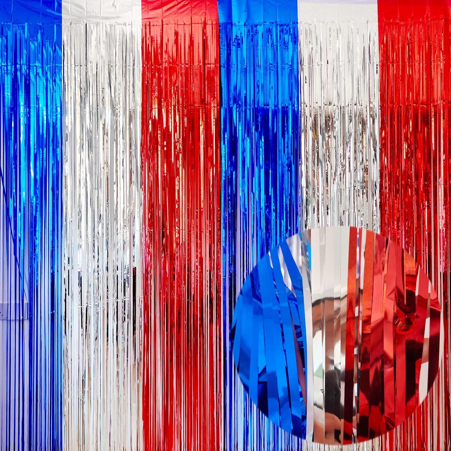 • PARTY BACKDROP DECORATIONS : The package includes 4packs red-silver-blue foil fringe backdrop curtains, each metallic tinsel curtain is 3.2ft(wideοΌ‰Γ—8.2ft(drop), wonderful accessories for decorating doorway, window and walls.