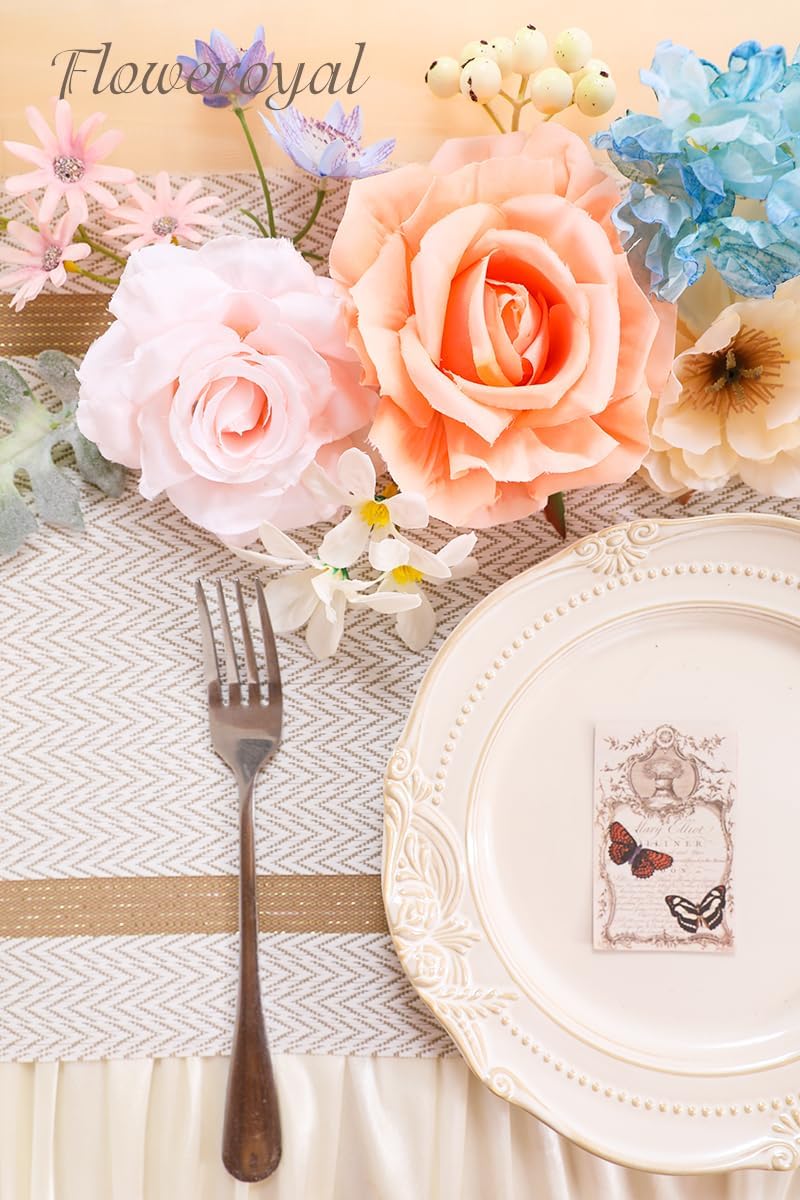 • โ™”EASY TO DIY & CARE-Floweroyal fake flower is a box of pre-selected flowers by color, size and type. If you don't know how to make flower arrangements, we have picked out all the right kind of flowers for you to create. Our flexible plastic flower stems have built-in iron wires. It's very easy to stick in flower mud to arrangements or bend for DIY. Do not have to water and no dead leaves. Easy to clean and remove the dust. Not easy to fade. Easy to store for a long time and use repeatedly.