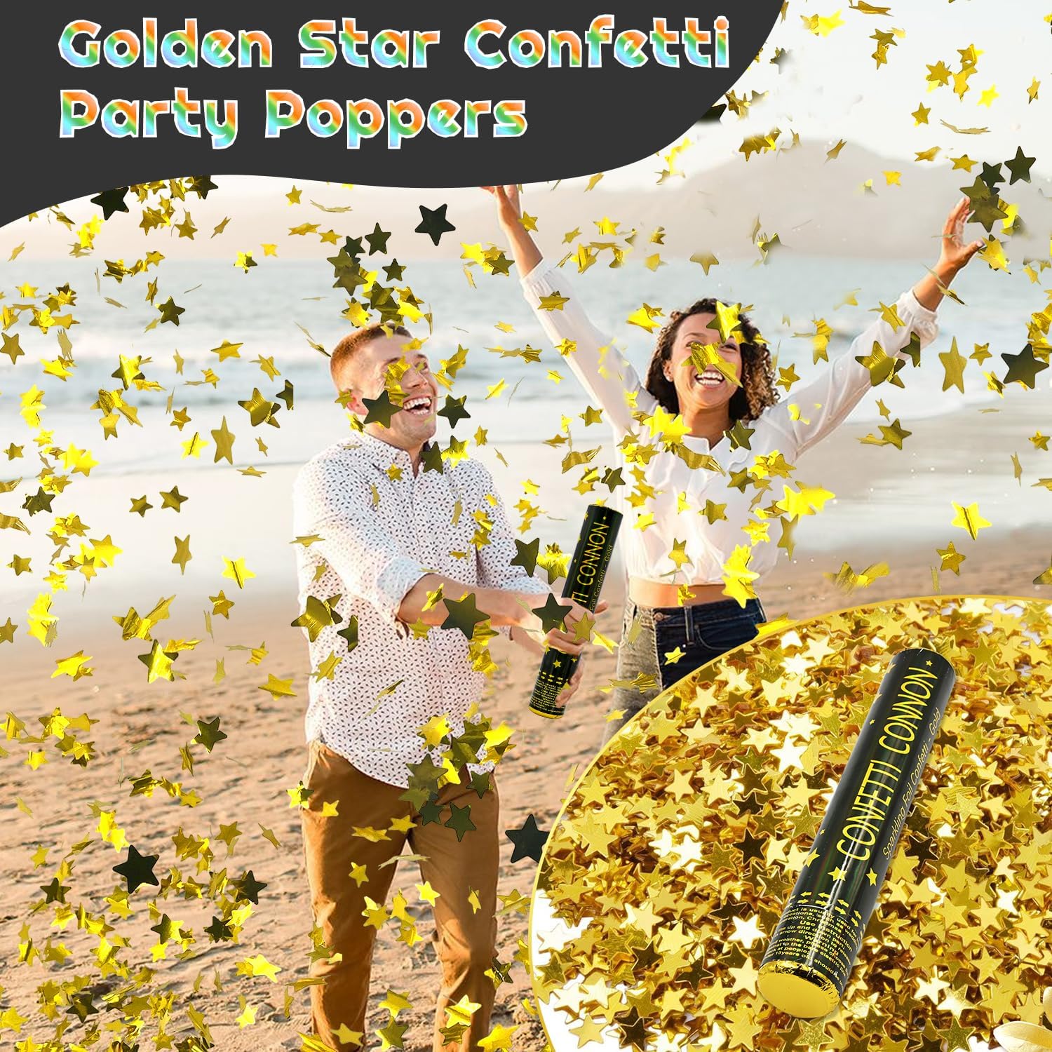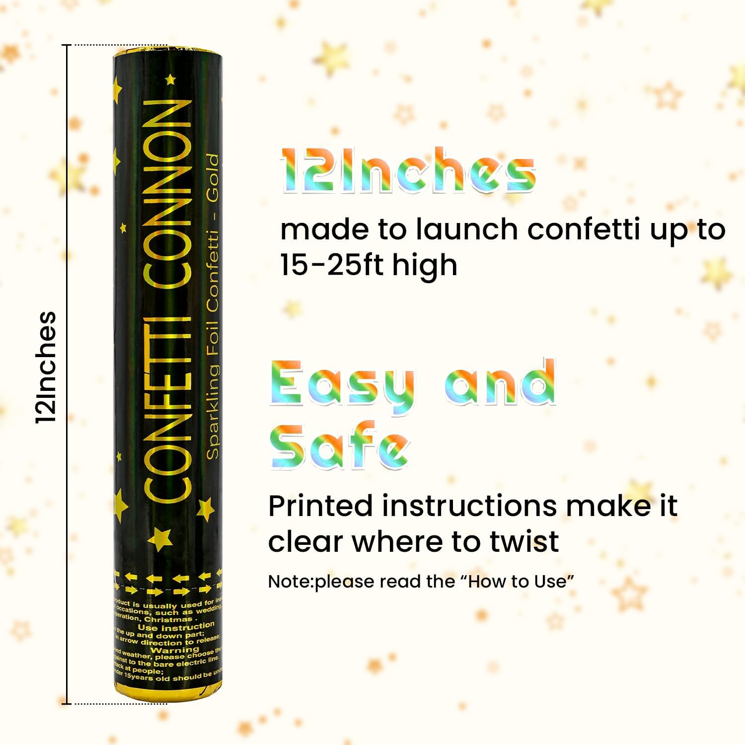 • 【Safe To Use Party Poppers】Safety is our top priority. Our confetti cannon kit is non-toxic, and made with foil confetti papers.With a simple twist of the bottom confetti poppers spray shiny gold star shaped confetti in15-25ft high. Create surprising, marvelous, and exciting effects with party poppers for birthdays, new year's eve party, graduation, festivals, and special announcements.