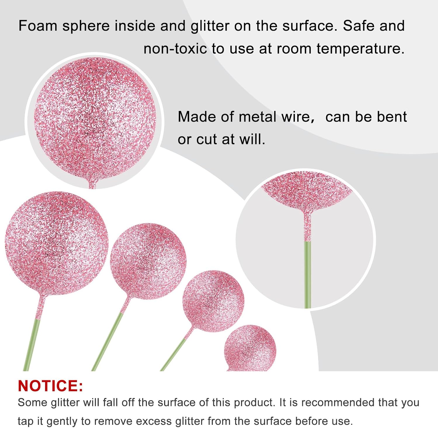• Material: these ball decorations for cake are made of foam and wire. Safe to decorate food at room temperature, such as cake and dessert decorating use, or cupcakes, fruits, cheese and any dish and appetizer you want to decorate.