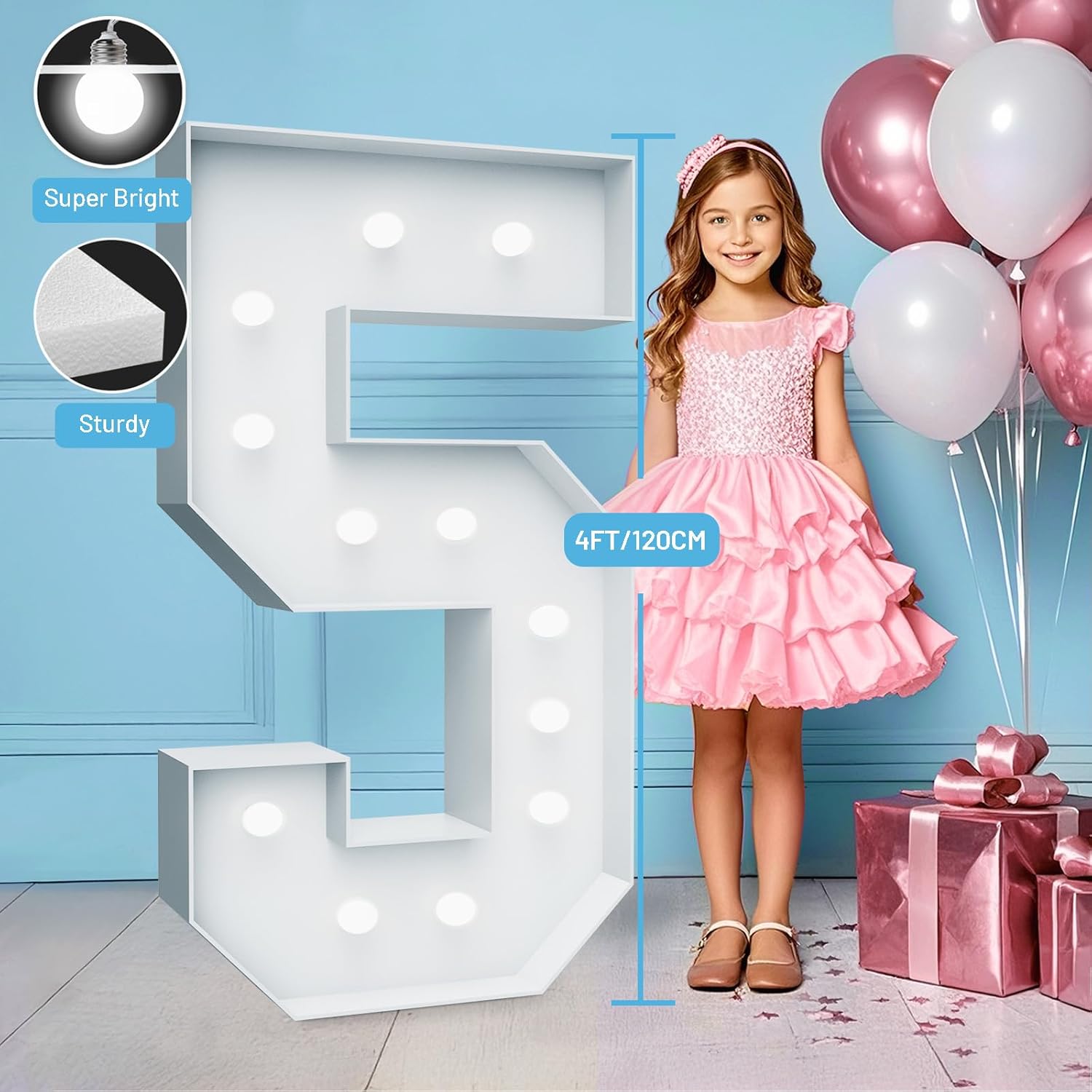 4FT Marquee Light Up Numbers - Cool White Light Up Numbers 5 with Fixed Water Bag, Party Decoration Large Marquee Light Up Numbers can Be Used for Wedding Decoration, Birthday Party Decoration