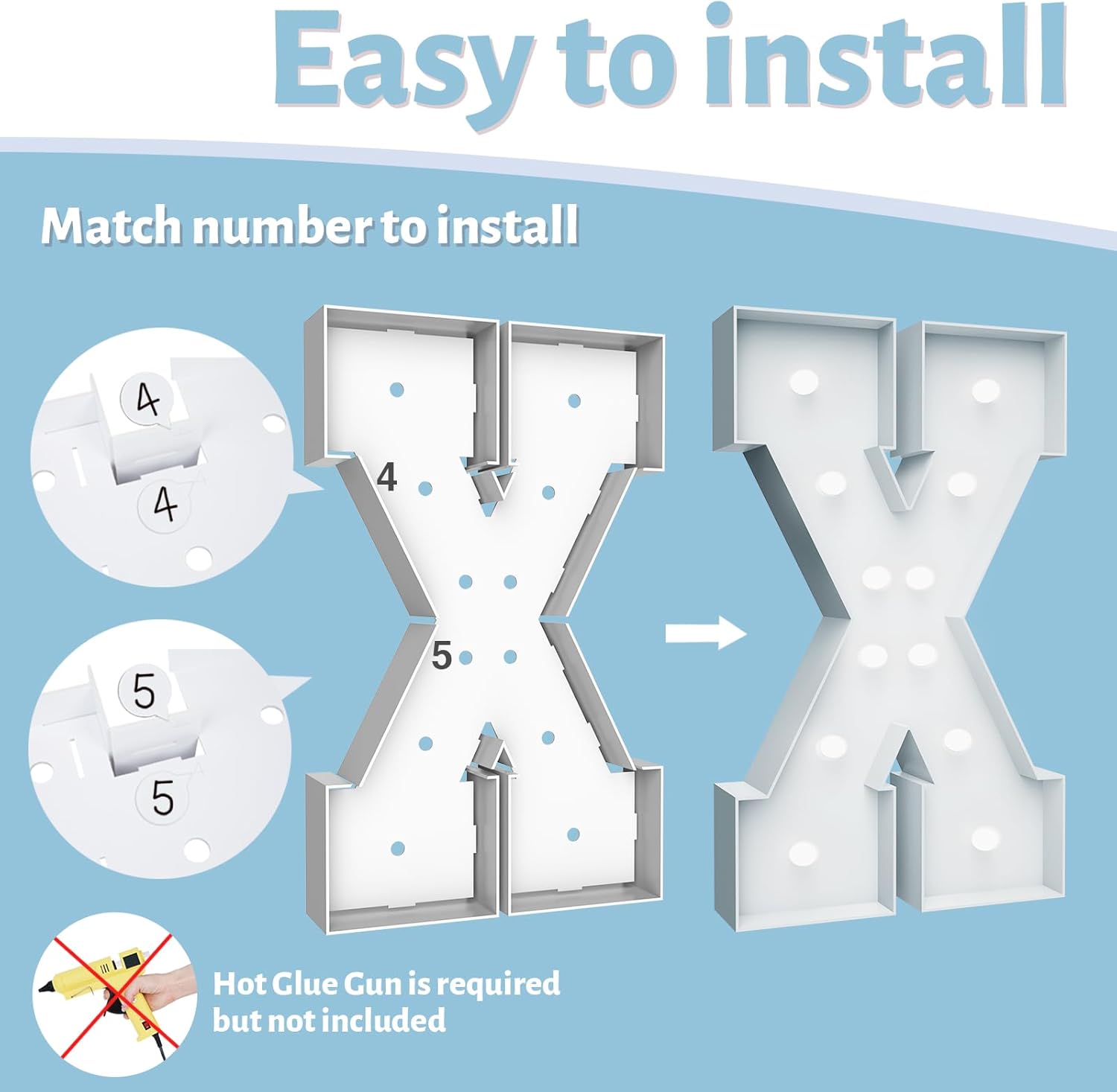 • ASSEMBLY REQUIRED: Marquee Light Up Letters consists of pre-cut frames with slots, the numerical markings in the mounting sequence will easily guide you through the matching, which requires a hot glue gun to bond and screw in the bulbs. Finish 4 feet tall checkbox letters (Note: Glue gun and batteries are not included)