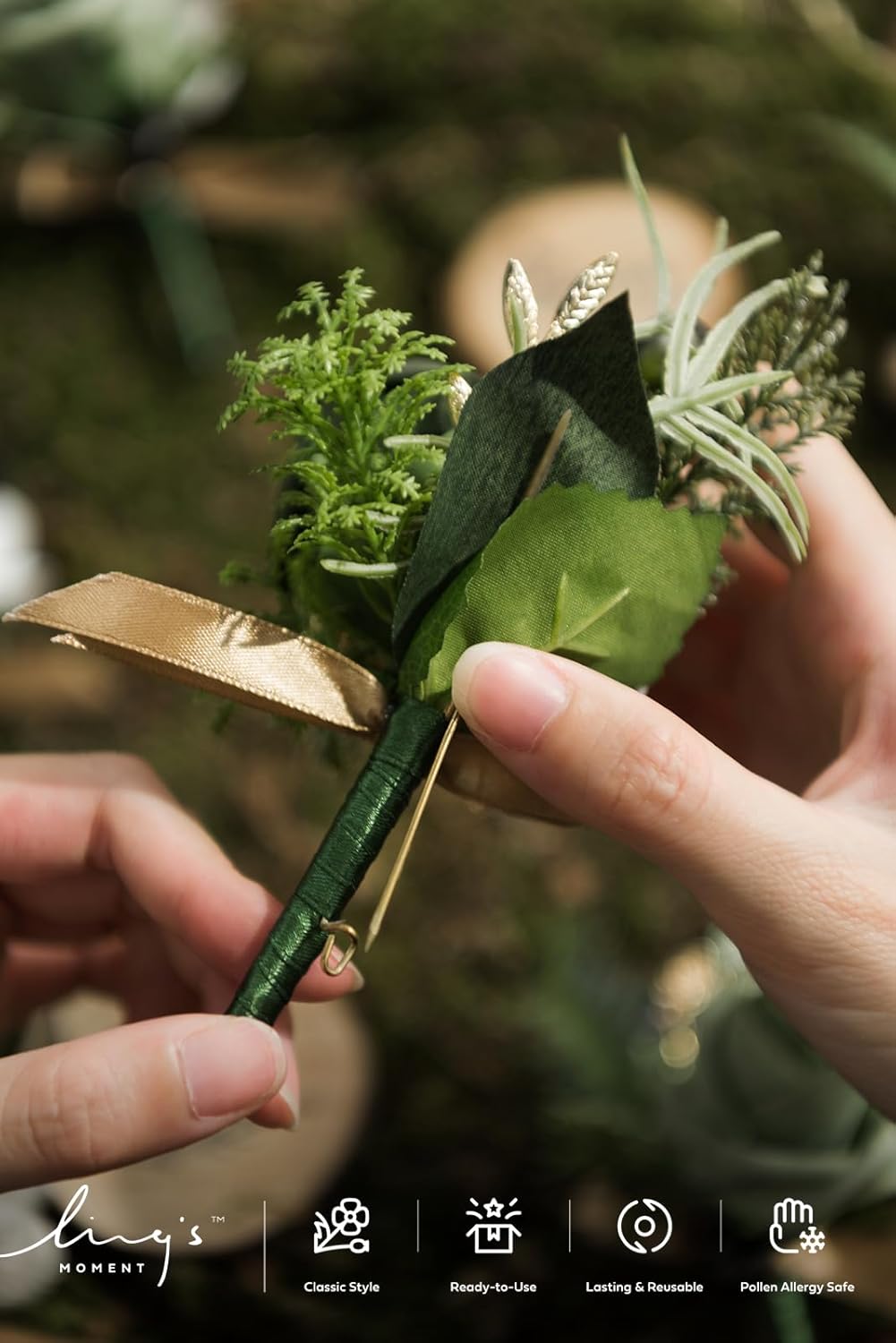 Ling's Moment Boutonniere for Men, 6pcs Groom Groomsmen Boutonniere, Artificial Flowers for Wedding Decor/Prom/Homecoming, etc.Green Beige