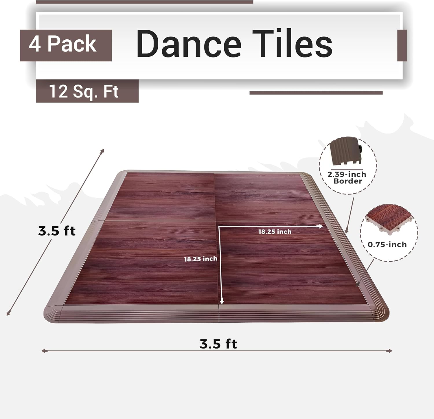 • Seamless Interlocking System: Each tile measures 18.25" x 18.25" with a sturdy 2.39-inch border and 0.75-inch thickness. These tiles securely interlock to create a smooth, gap-free surface, ensuring safety and stability during practice or performances