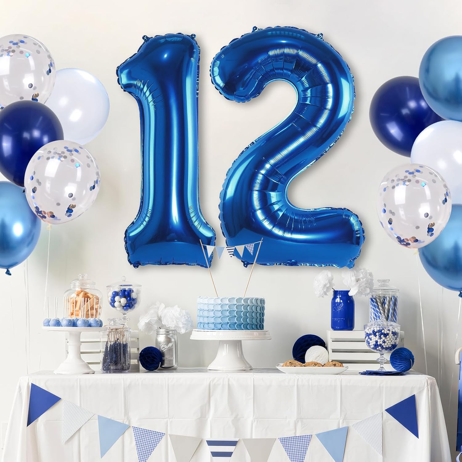 • πŸ’“ Dark Blue Number 12 Balloon: Our package included 40 inch foil number 12 balloon(2pcs), 12 inch metallic blue balloon(4pcs), blue silver confetti balloon(4pcs), pastel blue balloon(4pcs), Light Navy Blue Balloon(2pcs), 1pcs straw and 1 roll ribbon. Simply inflate the balloon using the straw, and you're ready to party! Navy blue number foil balloons are the best for girls or boys birthday party decoration.