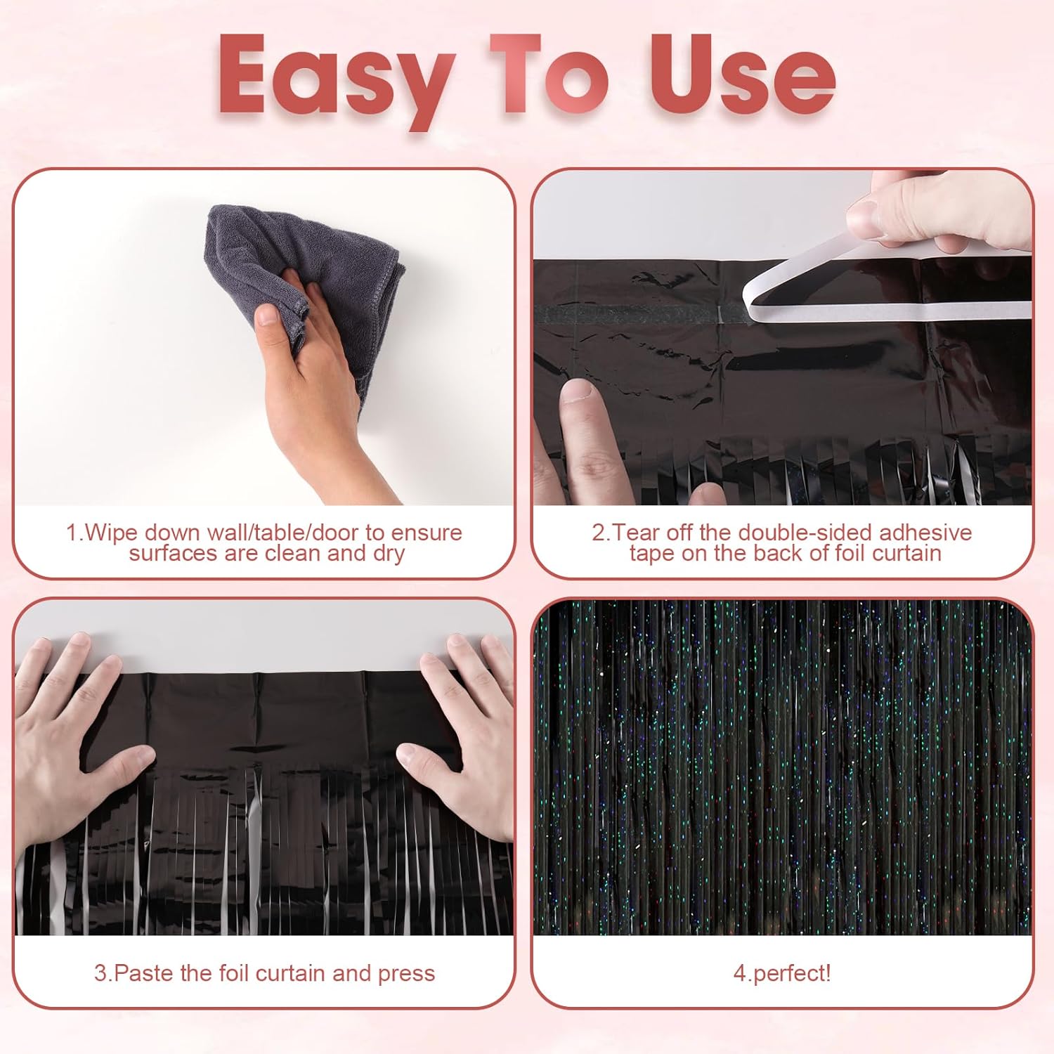 • How to Set up: Wipe down wall/table/door, ensure surfaces are clean and dry, tear off the double-sided adhesive tape, paste the foil backdrop curtains and press. Hang each individual tinsel fringe curtains in different locations for a fuller effect