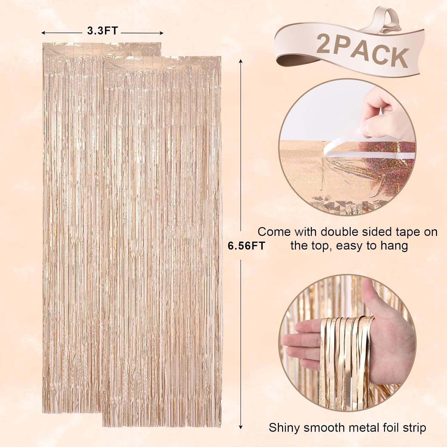 • Stunning Decorative Set: You'll receive 2 pcs champagne gold foil fringe backdrop curtains, each measuring 3.28 ft (wide)Γ—6.56 ft (drop). Enough length foil fringe curtains backdrops are perfect for the door or wall to create an impressive decoration
