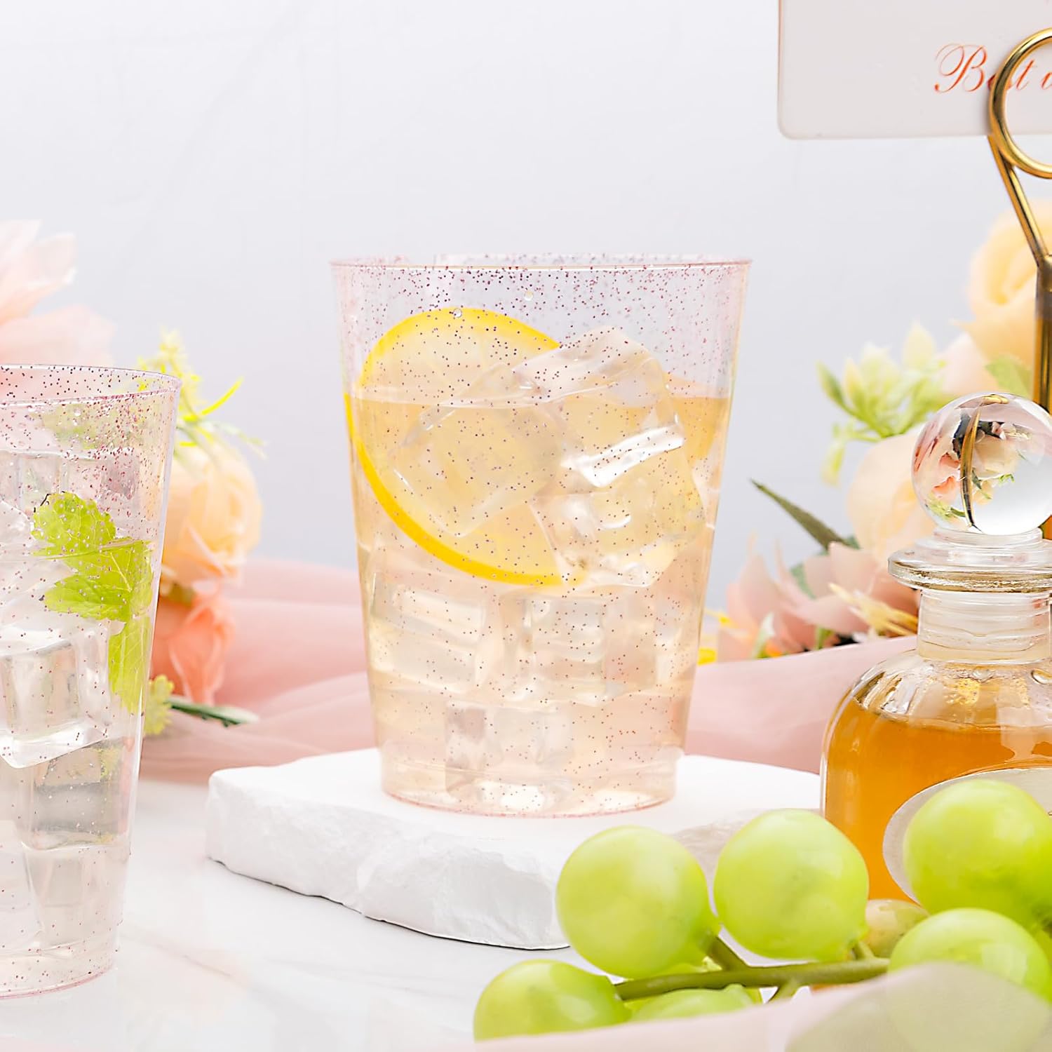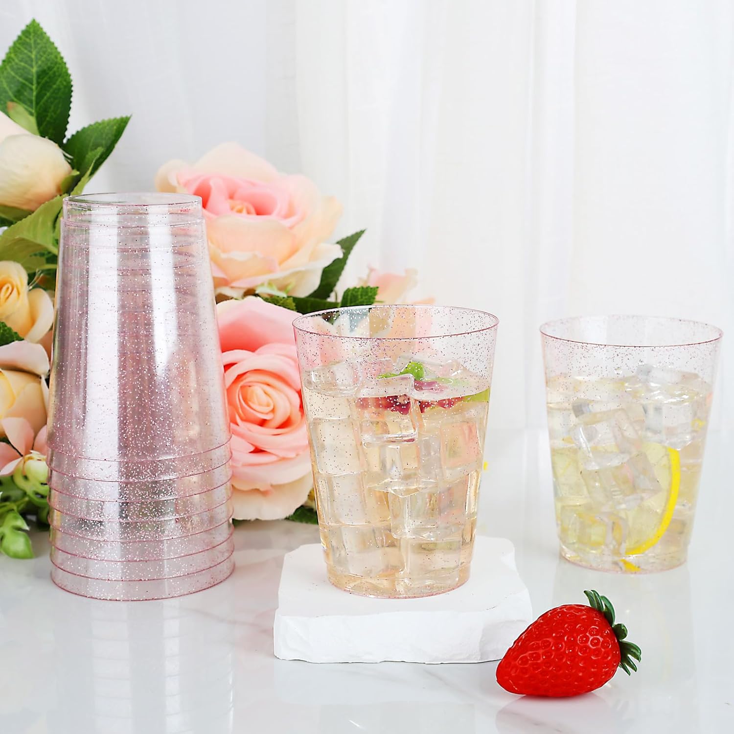 DaYammi 100 Pack 10oz Pink Plastic Cups, Premium Disposable Rose Gold Glitter Plastic Cups for Martini and Cocktail, Hard Clear Disposable Cup with Pink Glitter Perfect for Fancy Wedding Party