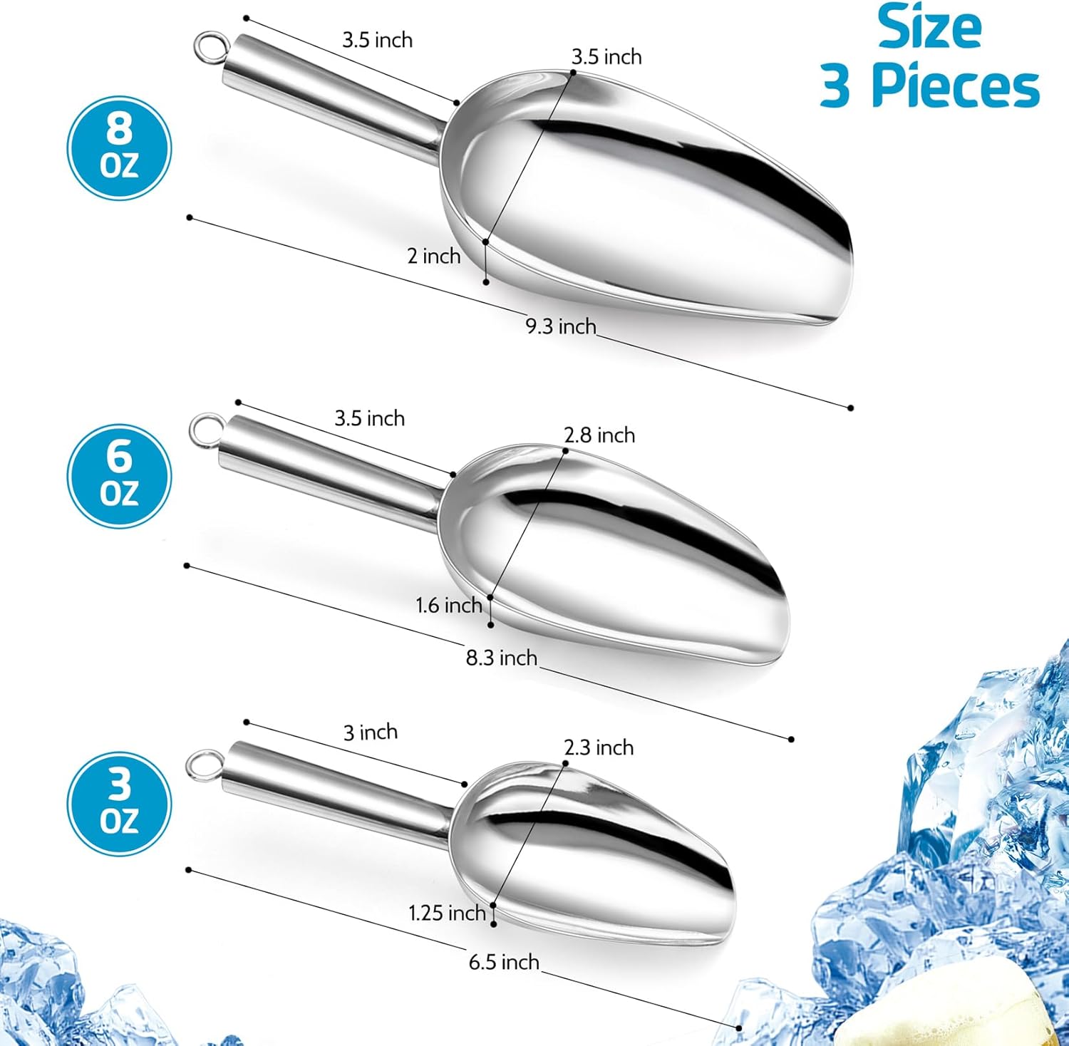 • 【3 + 6 + 8 Oz, 3 Pieces】 3-piece different sizes scoops from small to large would meet all your using needs in kitchen, bar, buffet, party and garden, Can easy to scoop ice cube, candy, popcorn, pet food, sand and soil, Lightweight and utility for daily use, Good gift for wedding, birthday or house-warming