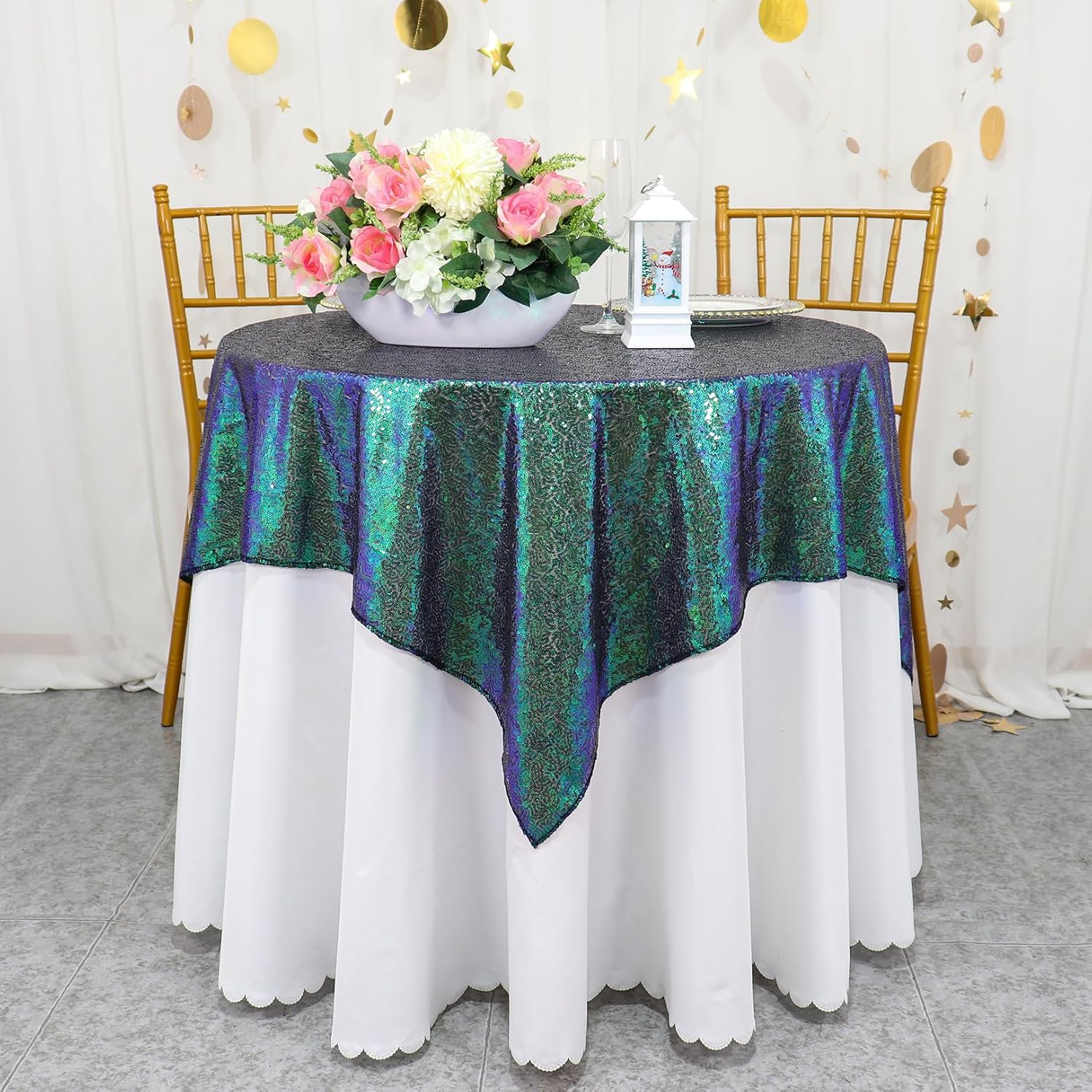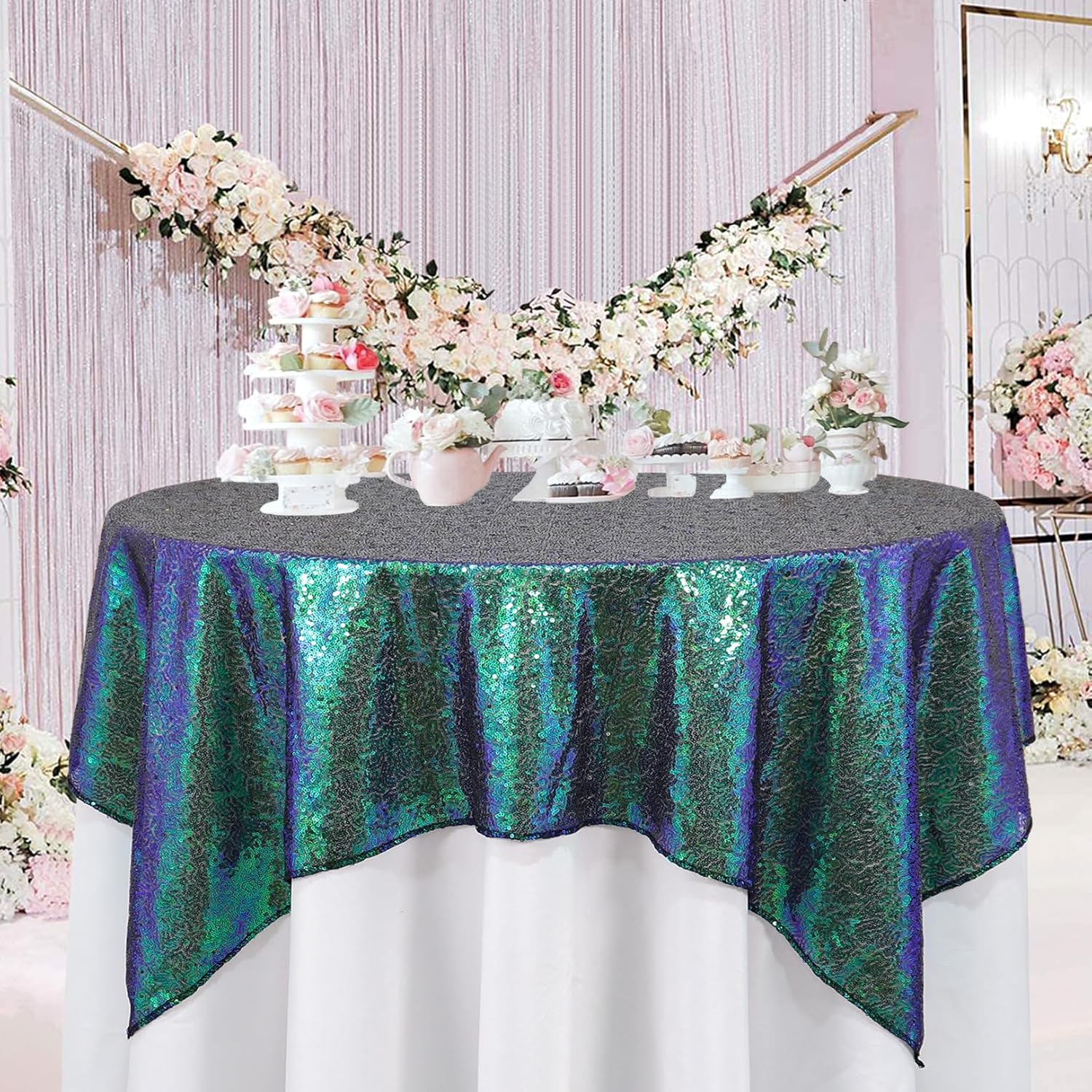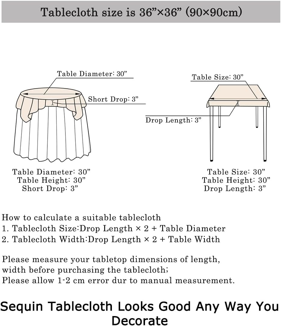 • ❤ SIZE OF SEQUIN TABLECLOTH : 1pc 36x36 Inch Iridescent Green Sequin Tablecloth Table Linen, this small square tablecloth is fit for small round tables under 36''