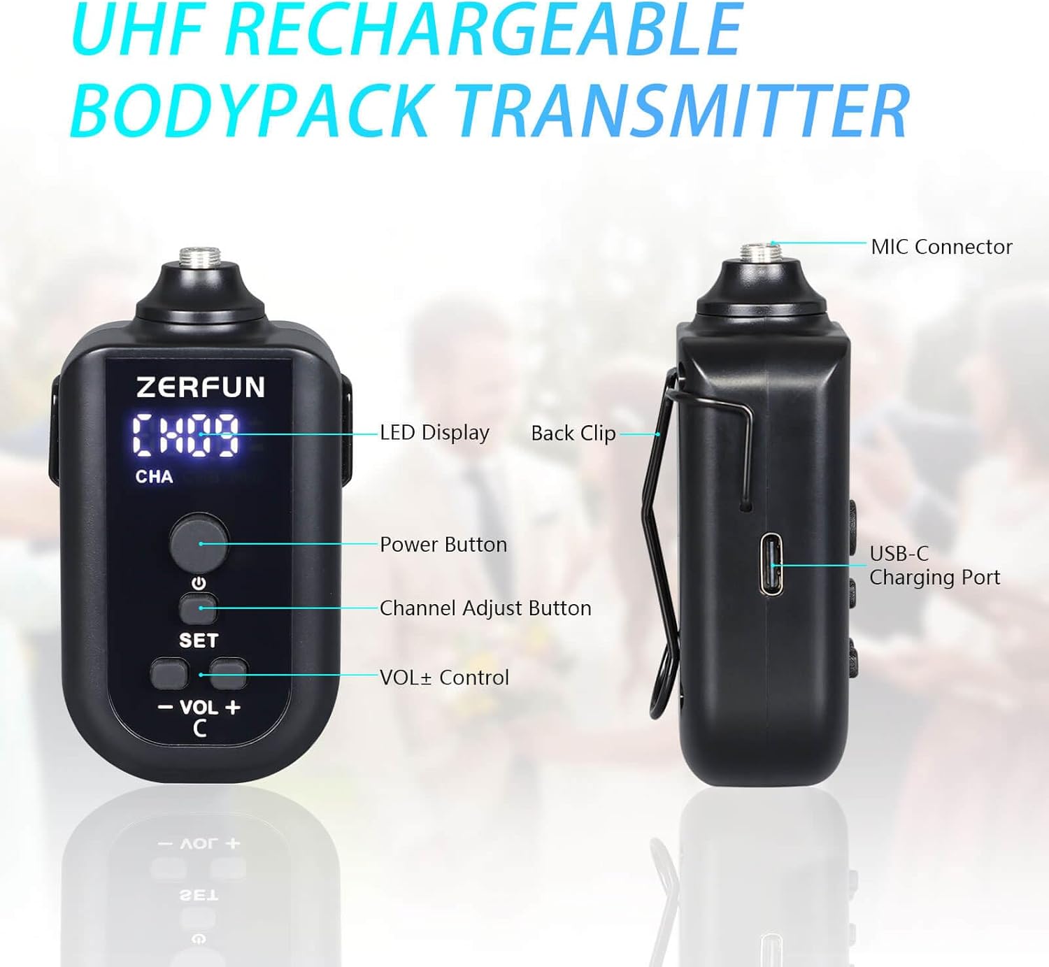 • BATTERY INFO & TRANSMISSION RANGE: Each microphone use built-in rechargeable battery. Microphone Working Time: 10-12 Hours(When full charged). This ZERFUN Wireless Microphone System can support up to 200 feet range, 50 compatible frequencies on each channel(4 X 50) for interference-free reception. The UHF frequencies range within 500 - 599 MHz, are compliant with the FCC regulations.