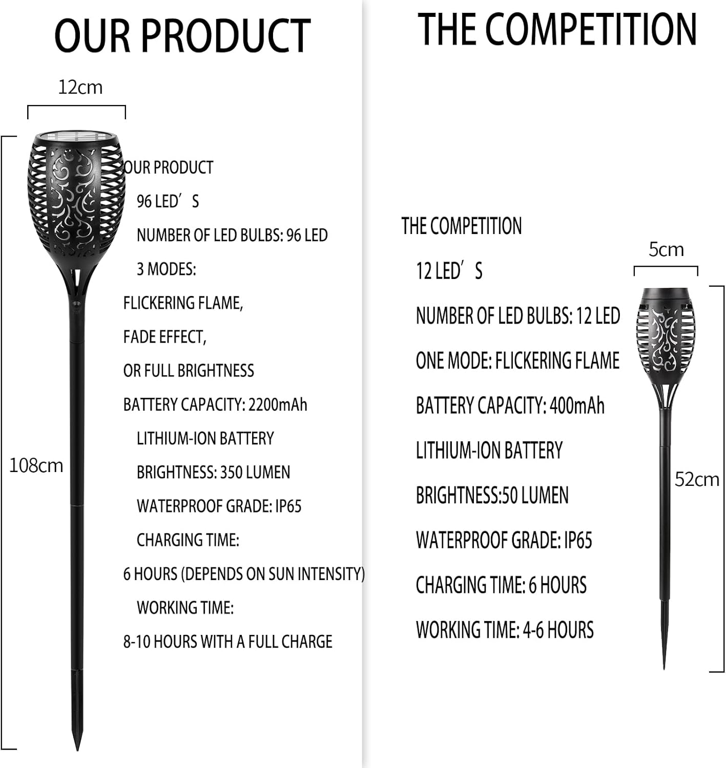 • Gorgeous Dancing Flames: Our self-charging solar lamps charge by day and turn on automatically at night. They have 3 beautiful modes; Flickering Flames, Slow Fade from On/Off/On, or Full Brightness. They are gorgeous and attractive and look fantastic as decorative outdoor lighting. Whether lining pathways and driveways, placed in gardens, or just used during the holidays such as Halloween or Christmas, these light can do it all.