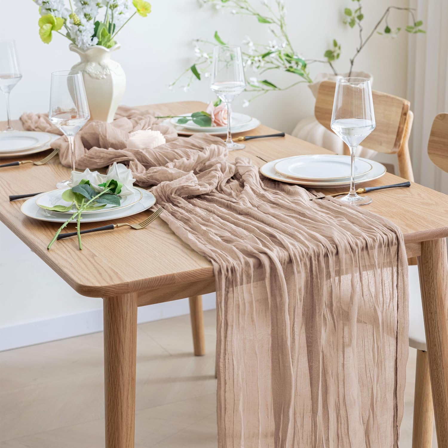 • 【Cheesecloth Table Runner】 Size: 35" W x 120" L. You will get 12 pieces 10FT length cheesecloth table runner. The sheer rustic table runner is long enough to span a large table and drape gracefully across the table. It will gently sway in the wind, adding a romantic atmosphere to your occasion. These eye-catching gauze table runners are ideal for arranging an elegant, stylish tablescape.