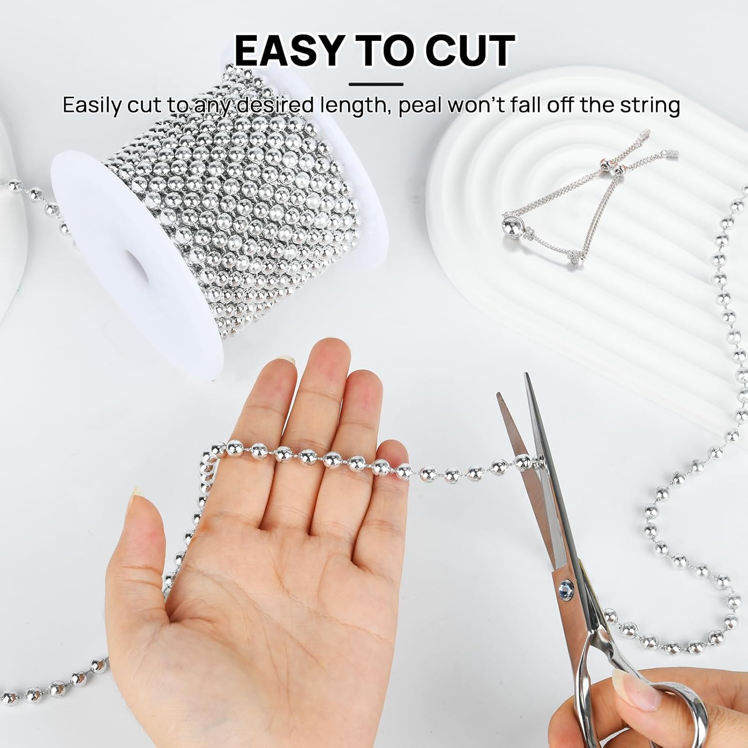 Craft String Pearls 6MM Pearl Bead, 66 Feet Silver Faux Pearl Garland Spool Roll Strand Wedding Party Decoration, Christmas Tree Decorations