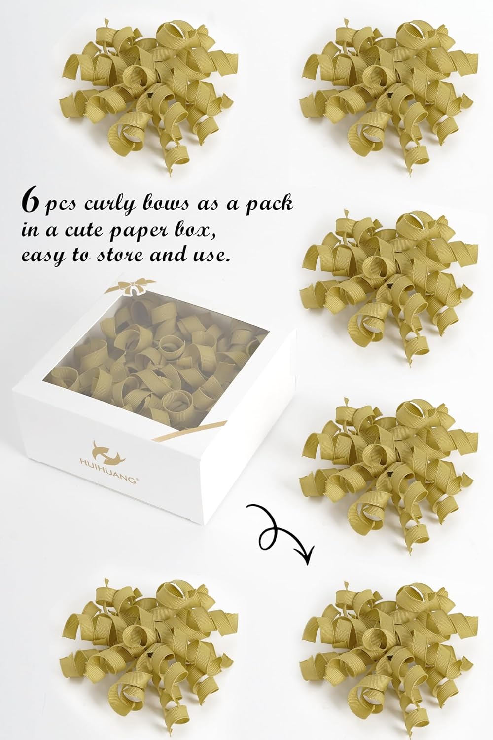 • SIZE & PACK: Each package contains 6 pcs Gold crimped curly bows are made of 12 strands of 3/8"(9mm) wide grosgrain ribbon that measure about 4.5~5" x 4.5~5"