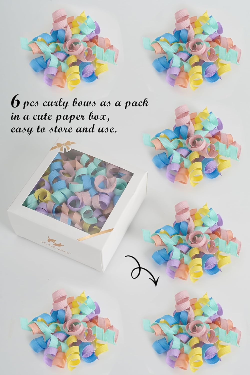 • SIZE & PACK: Each package contains 6 pcs pastel rainbow color curly bows are made of 12 strands of 3/8"(9mm) wide grosgrain ribbon that measure about 4.5~5" x 4.5~5"