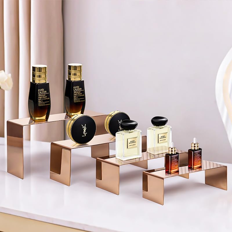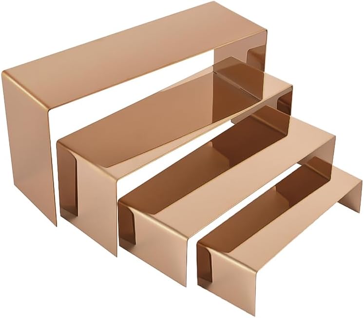 4 Pcs Stainless Steel Display Risers, Display Stand for Cupcake Dessert Perfume Purse Handbag Shoe and Funko Pop, Rose Gold