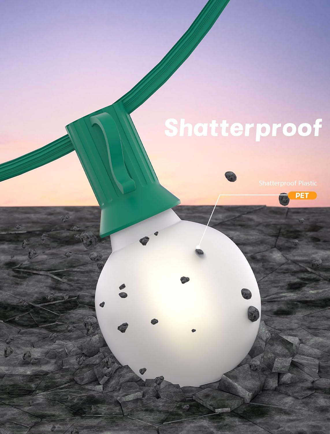 • Shatterproof and Energy Saving: The G40 string light is made of high-quality shatterproof material that can withstand accidental drops and impacts. Each 0.6W LED bulb saves more than 85% energy than incandescent bulbs. G40 globe christmas lights have a service life of up to 20,000 hours, which can reduce the cost of frequent bulb replacement. 25ft shatterproof outdoor christmas string lights are great mood lighting for apartments, patios, decks, weddings, parties, umbrellas, backyards, pergolas and more
