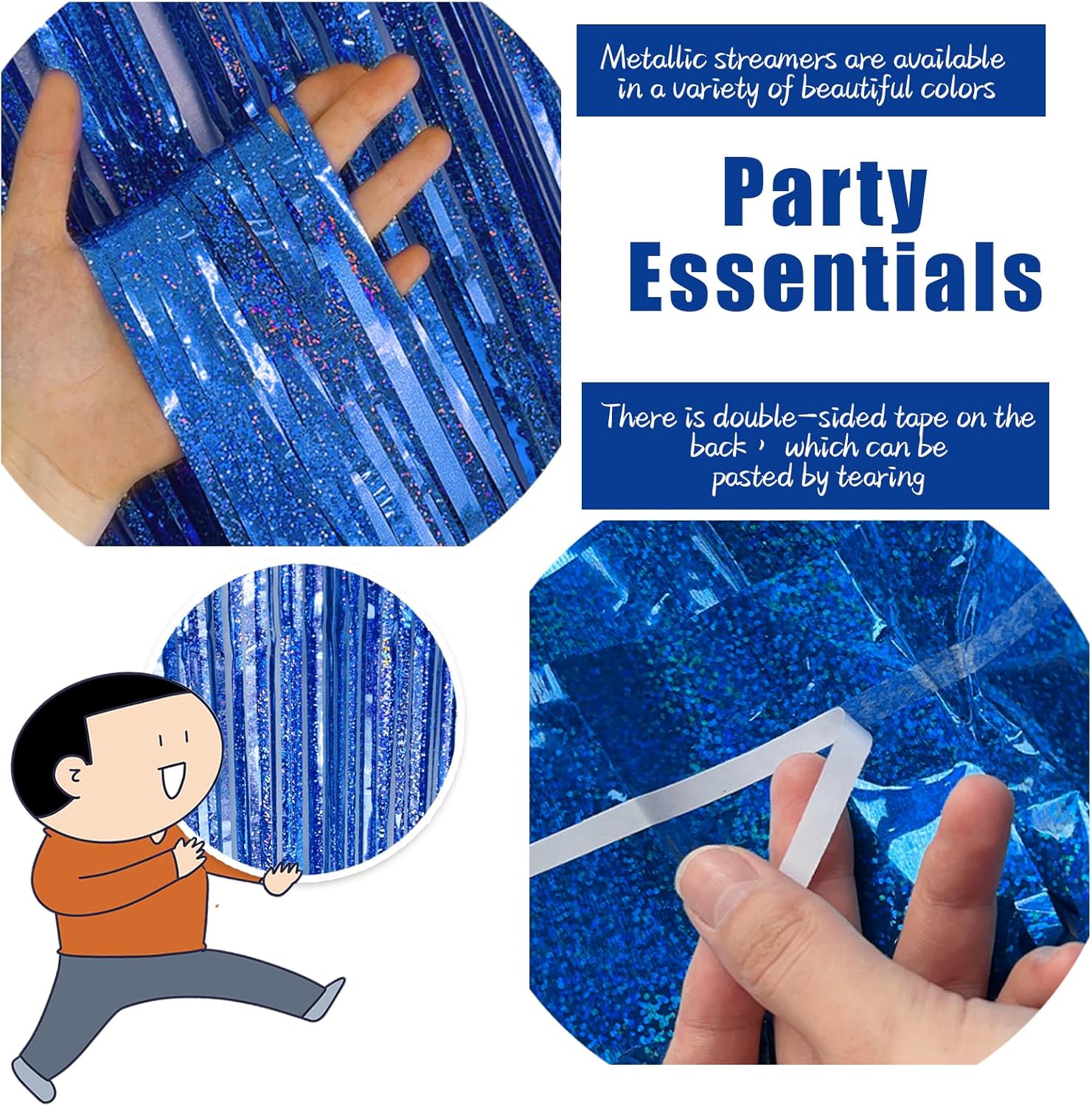 • Blue Birthday Decorations:3 packs of foil fringe curtains, the size of the foil curtain is 3.28 ft x 6.56 ft.It's long enough to fit any occasion. Please do not stick the foil curtain on uneven or stained walls to prevent it from falling off.