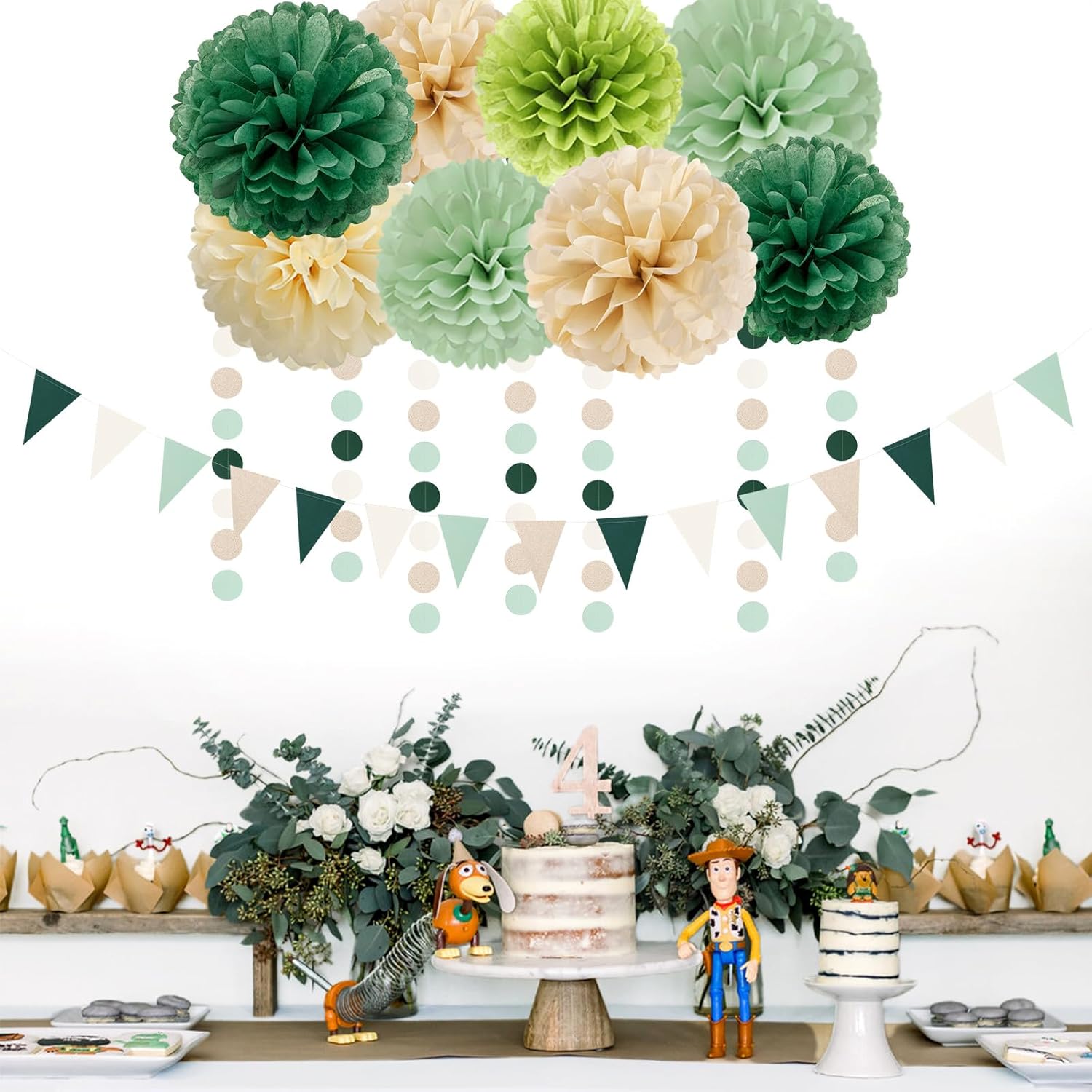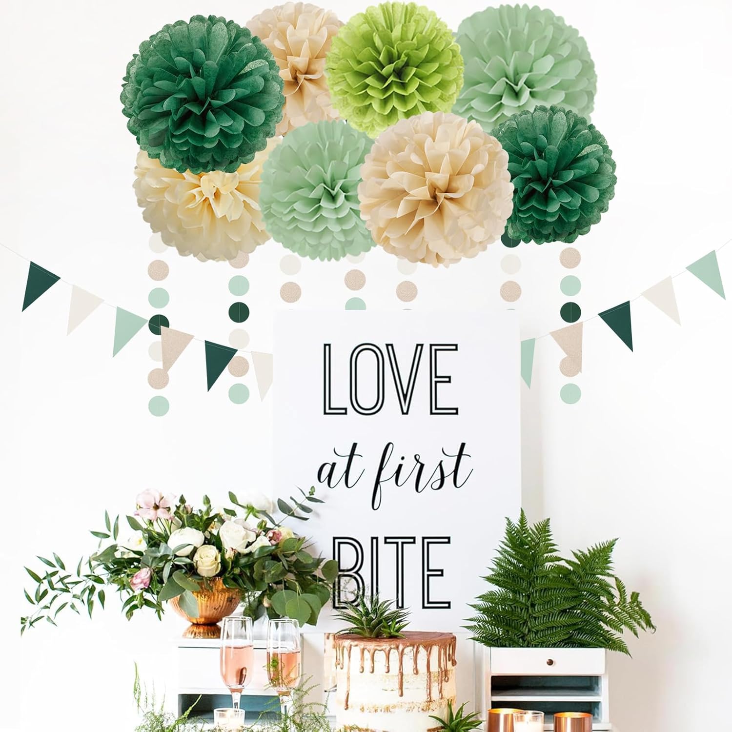 • 【Sage-Olive Green Champagne-Gold Party Kits】The party decorations kits include 8pcs tissue paper flowers: 4pcs 8" and 4pcs 10" in sage green,olive green,champagne color, 1pcs Triangle Flags,1pcs circle dots paper garland,20pcs tassel garland. Total30pcs.