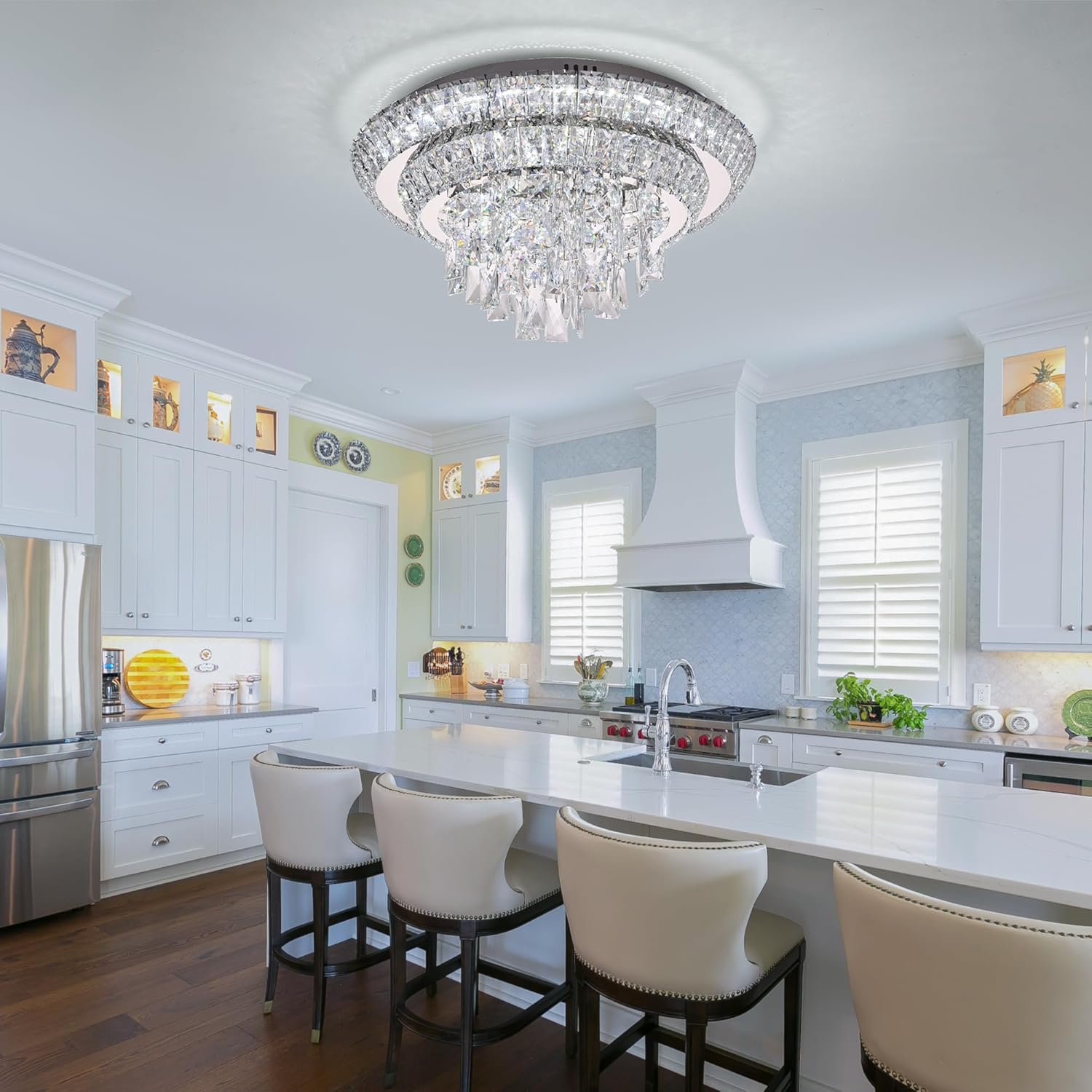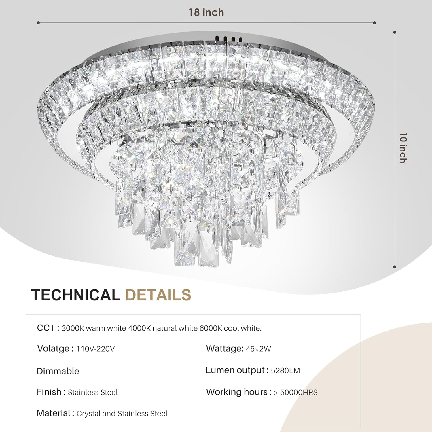• Crystal flush mount ceiling light: made of K9 crystal and stainless steel; 3 modes lights Warm/natural/white is adjustable with wall switch; Coming remote is easy to control for all functions and temp or brightness's control.