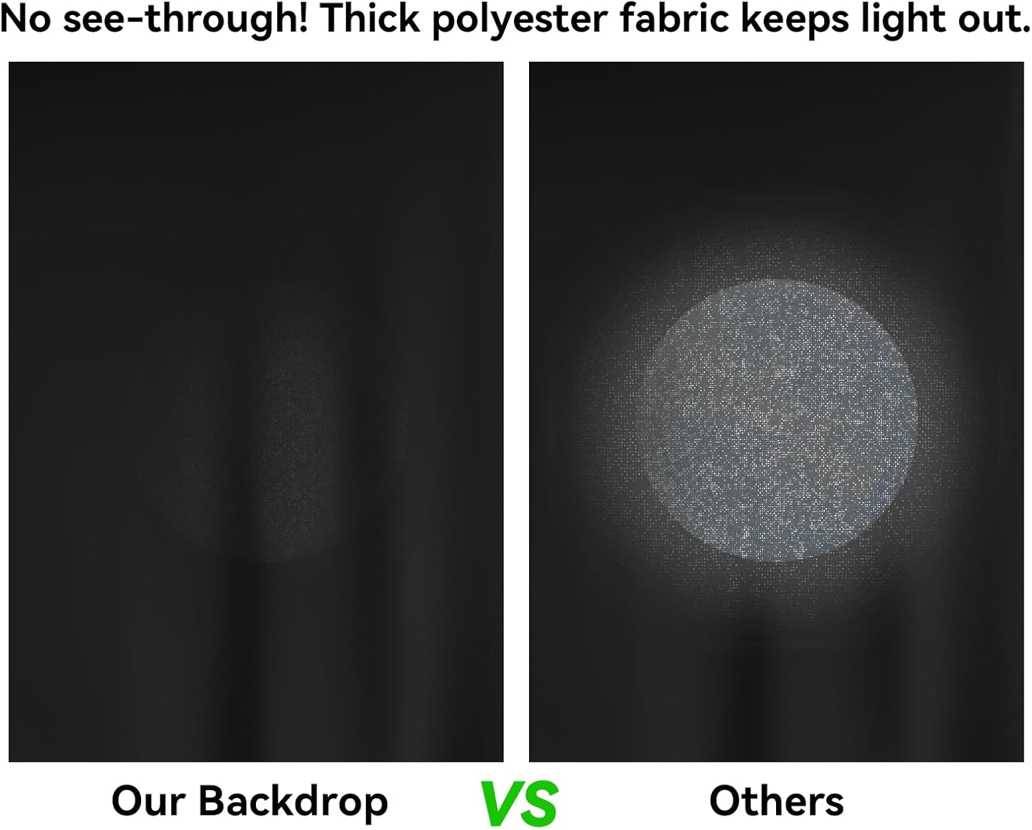 • 【100% POLYESTER FABRIC BLACK SCREEN】The Vevelux black photo backdrop is crafted from high-density 100% polyester, featuring: seamless & double-sided use, non-reflective, true-color (no color cast), fade & pilling resistant, superior drape with minimal wrinkles and quick recovery, lightweight & portable for easy storage/transport. Ideal for studio-quality shooting results