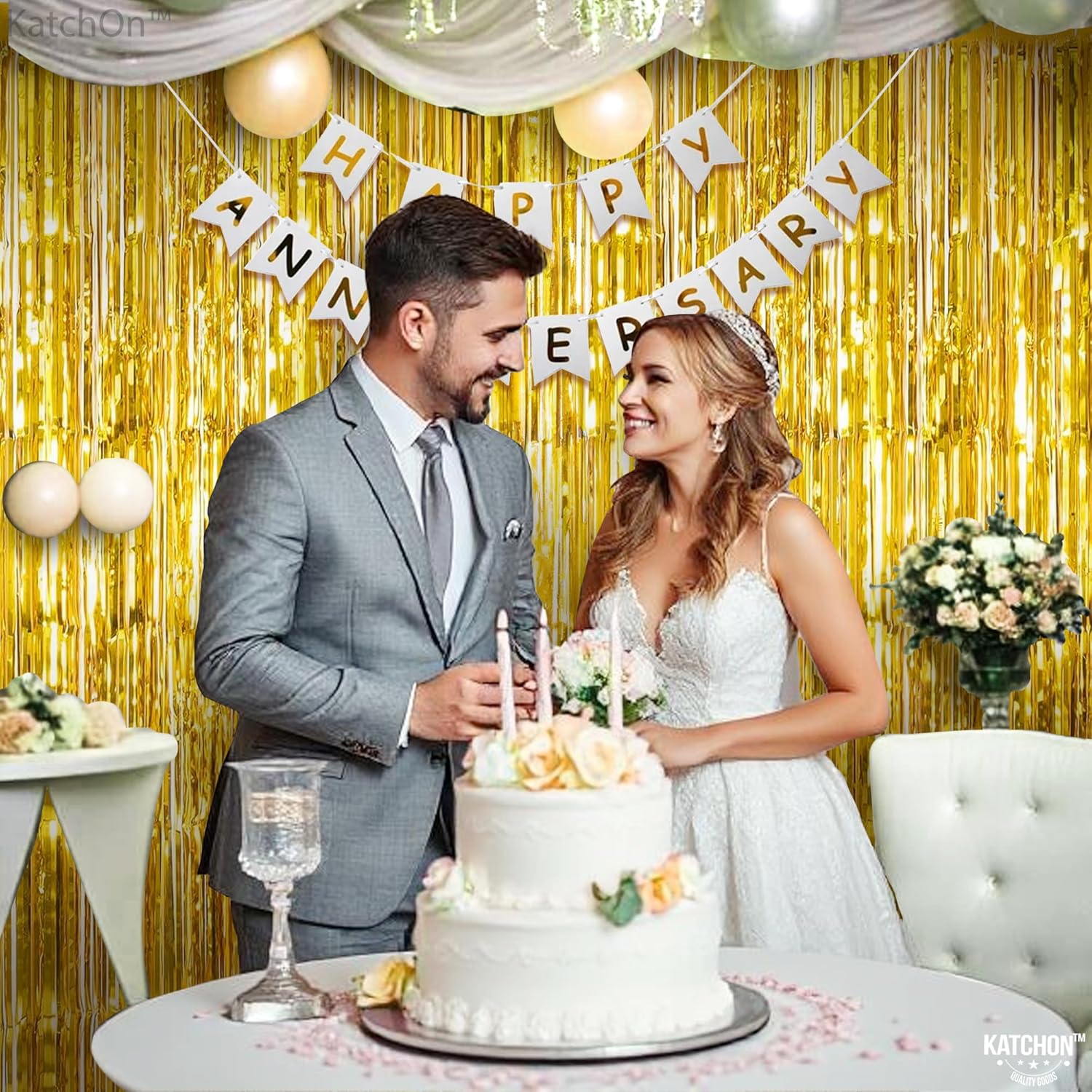 KatchOn, Gold Backdrop Curtain - 2 Pcs | Foil Fringe Curtain for 50th Birthday Decorations | Gold Streamers for New Years, Casino, Bachelorette, 50th Anniversary Decorations
