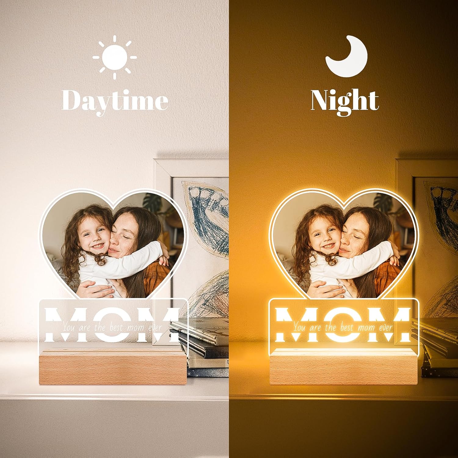 Personalized Birthday Gifts for Mom from Daughter and Son, Custom Heart Picture Frames with Photo, Personalized Photo Frame with Night Light, Customized Mom Gifts for Baby Kids Family