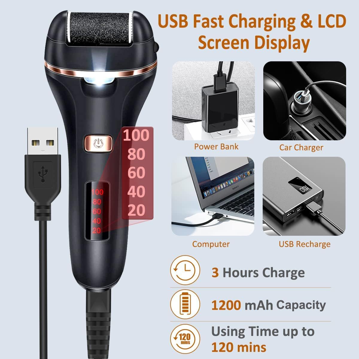 • 【 Power Level Indicator】 Rechargeable foot callus removers charging time for 2-3 hours, it can powerfully run continuously for about 120 Minutes. USB Charging Cable can be charged easily with power bank, car charger, computer, etc. You can easily see how much power left and when to charge.