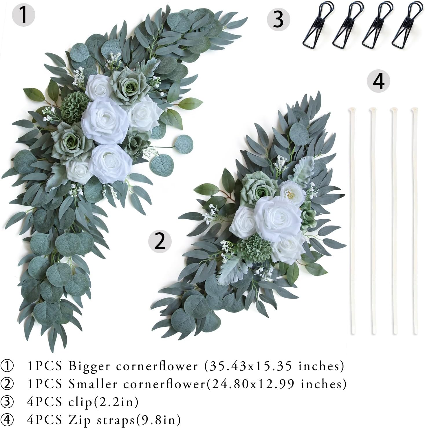 • Package Including: Sage Green Wedding Flowers Ornament x2 + Cable Tie x4 + Metal Clip x4, (Bigger corner flower 32.5X 14.8'', Smaller corner flower 20 X 10.8'', Clips 2.2'', Zip Straps 11.8 '')