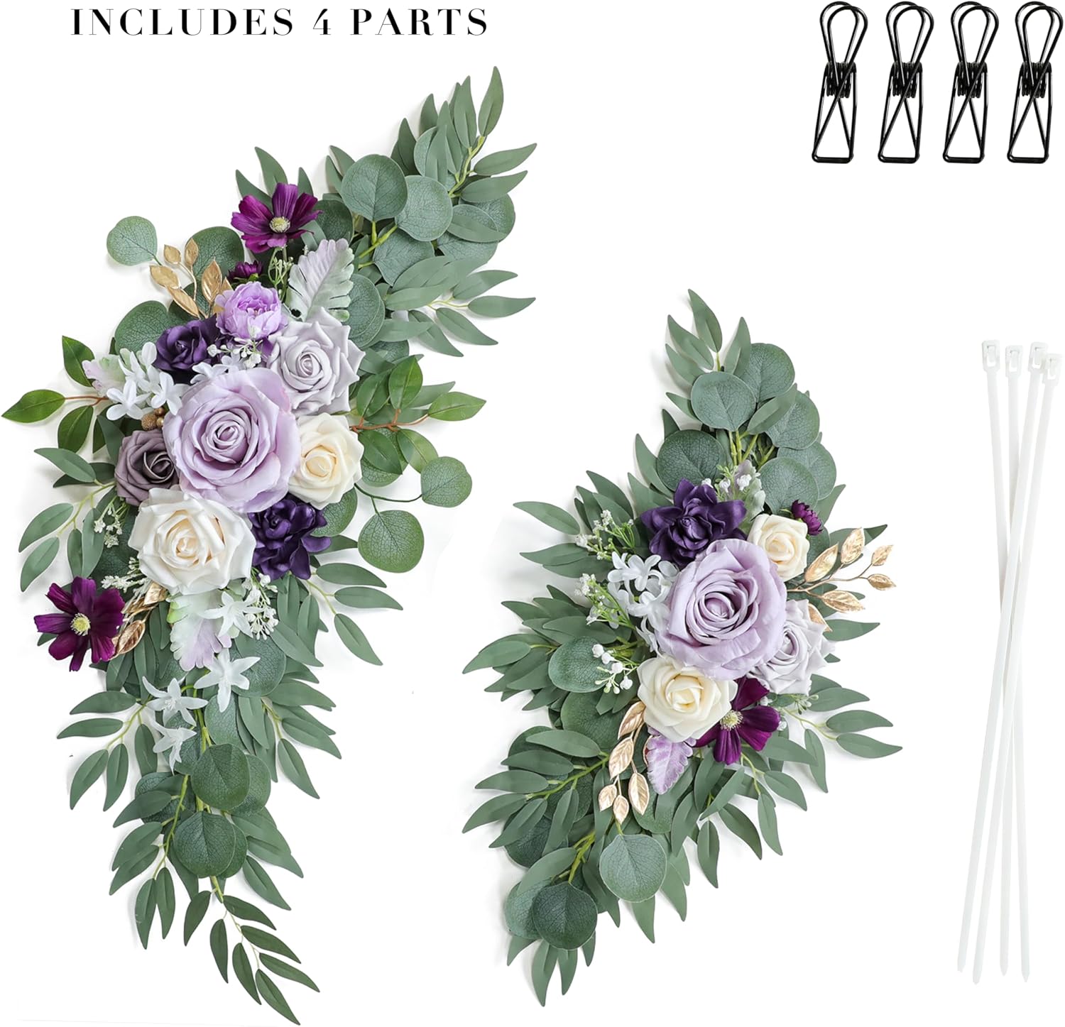• 2. Package Included: Wedding Flowers Ornament x2 + Cable Tie x 4 + Metal Clip x 4 (Does not include wooden sign and bracket). Suitable for round, hexagonal, triangular arches, etc. You can also easily hang them on your fireplace, front door, window, or living room wall after the party.