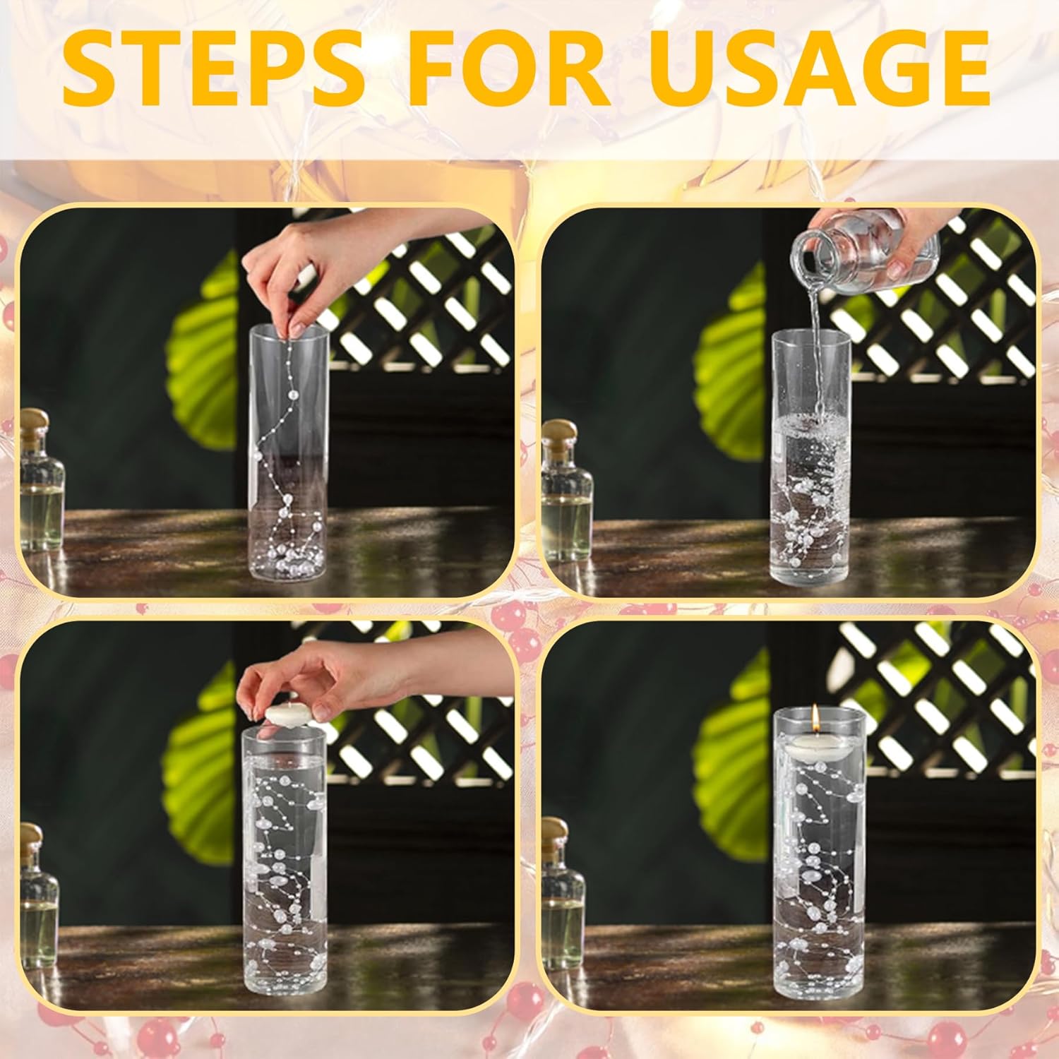 • Pearl String Beads: These artificial fake pearls strands are designed for floating candles, easy to use, just fill the string beads into the floating candle glass candle holders; you can also fill the vase with water and add 2 or 3 strands of beads string, which will make the centerpiece more romantic and gorgeous, for tall or large vases, just fill it with more strands of pearl decorations to bring a rich and luxurious look to your precious vase filler