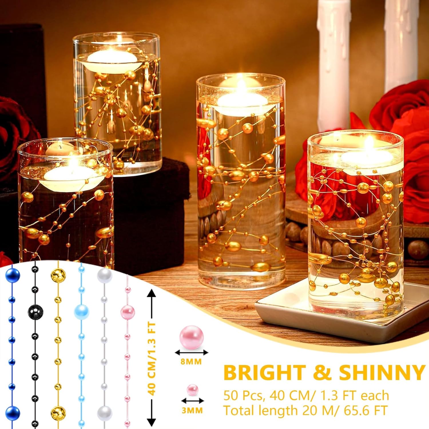 • Pearl String Beads: These artificial fake pearls strands are designed for floating candles, easy to use, just fill the string beads into the floating candle glass candle holders; you can also fill the vase with water and add 2 or 3 strands of beads string, which will make the centerpiece more romantic and gorgeous, for tall or large vases, just fill it with more strands of pearl decorations to bring a rich and luxurious look to your precious vase filler