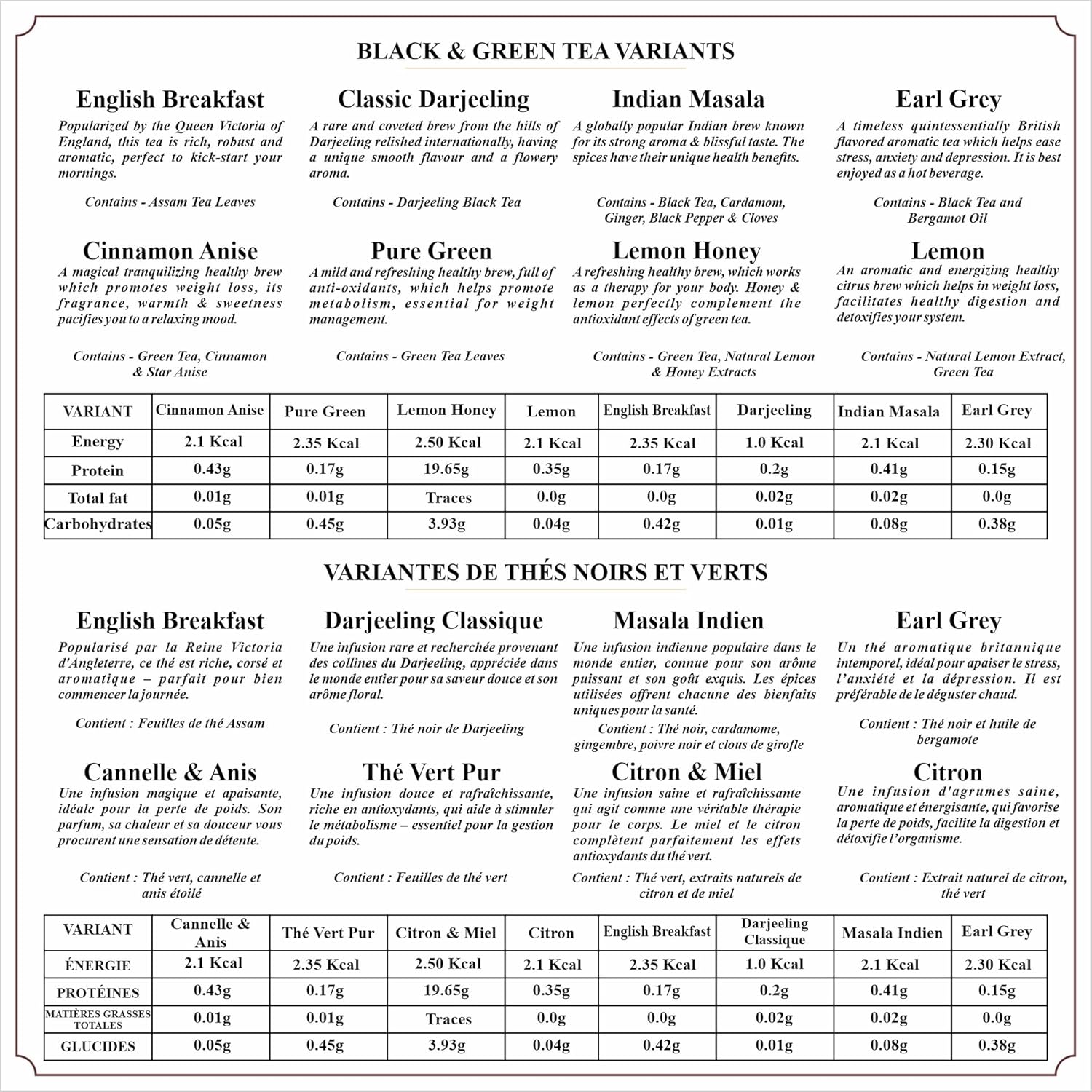 • Flavor : Pure Green tea , Cinnamon Anise Green Tea, Lemon Green tea, English Breakfast, Classic Darjeeling, Indian Masala ChaiPure Green tea , Cinnamon Anise Green Tea, Lemon Green tea, English Breakfast, Classic Darjeeling, Indian Masala Chai See more