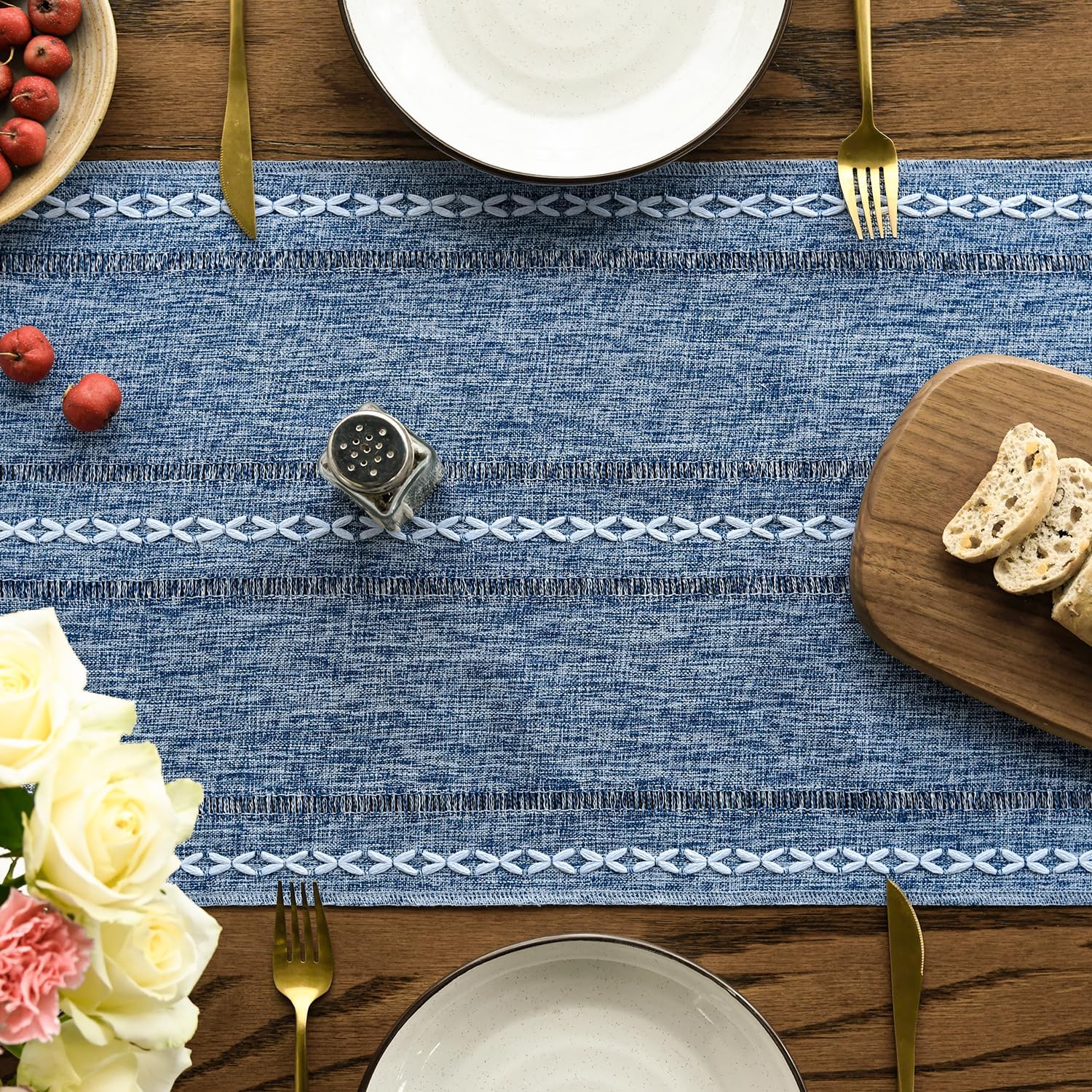Artoid Mode Blue Rustic Cotton Linen Table Runner, Seasonal Embroidered Hollow Kitchen Dining Table Decoration for Home Party Decor 13x60 Inch