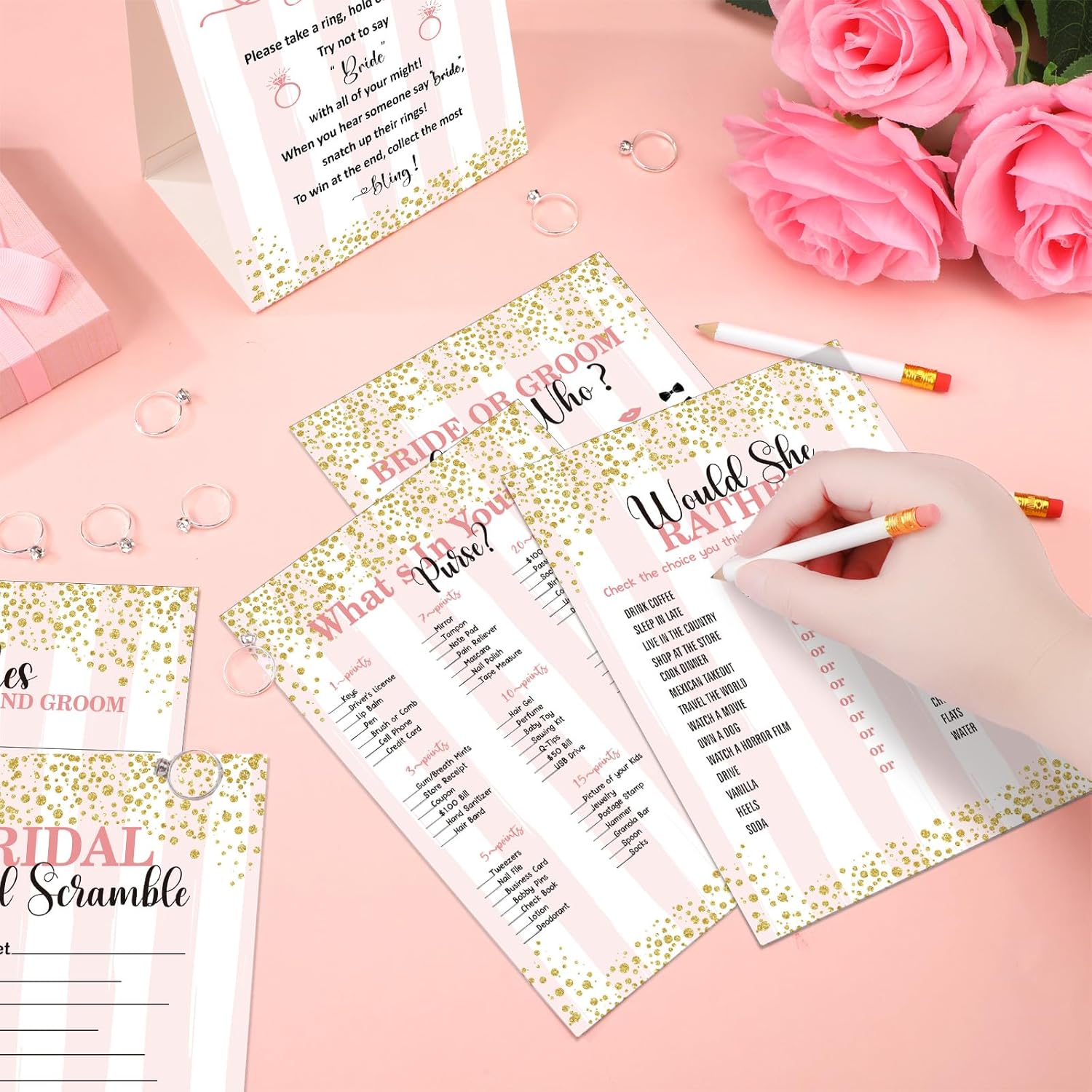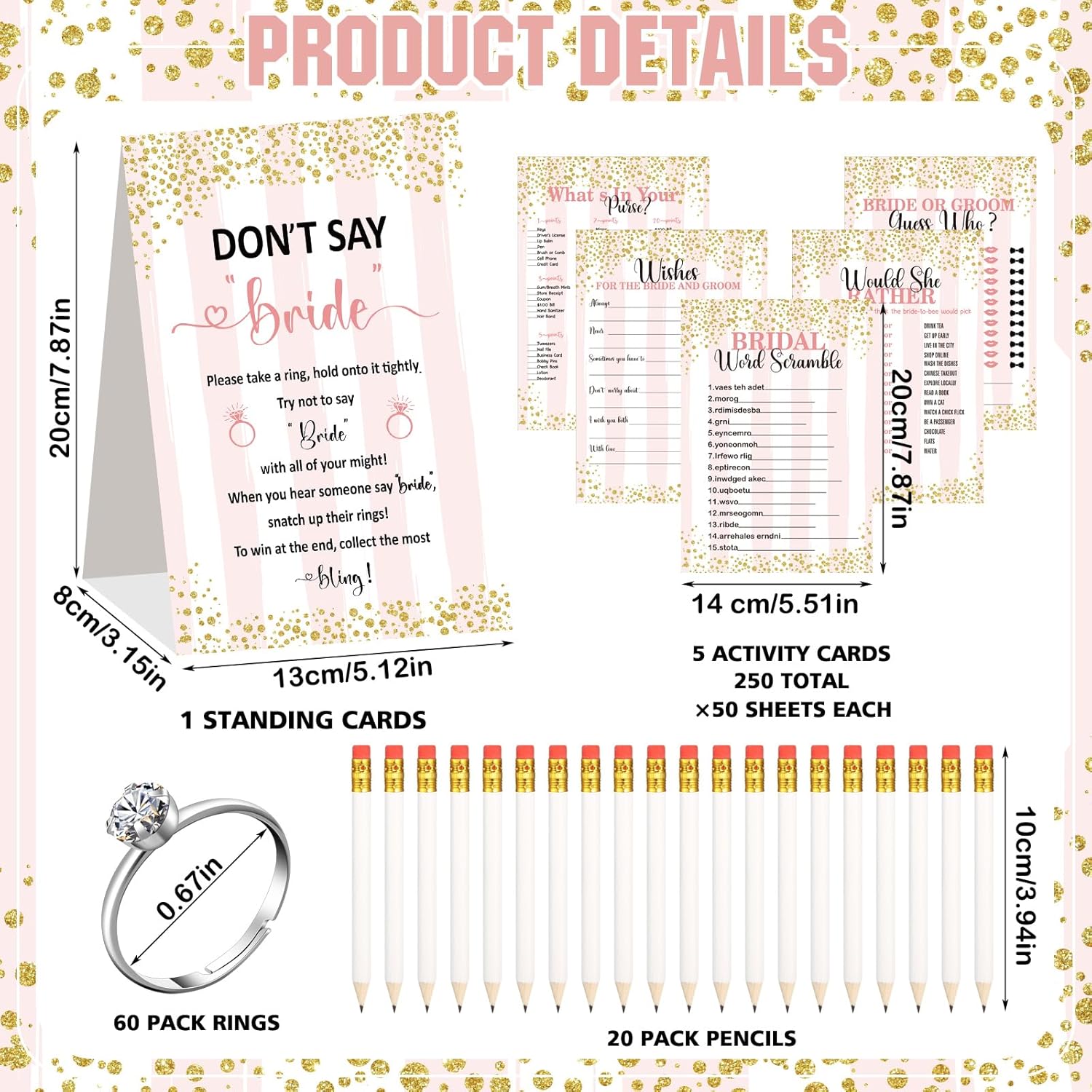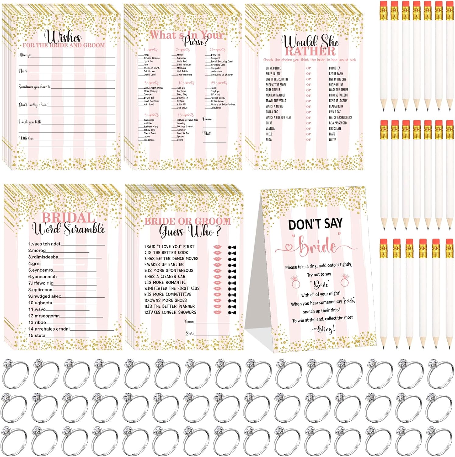 • Funny Bridal Shower Games: you will be provided with 250 pieces of gold confetti themed wedding games cards, 1 piece of wedding sign, 60 pieces of rings and 20 pieces of pencils, sufficient quantities can entertain your families and guests in bridal shower