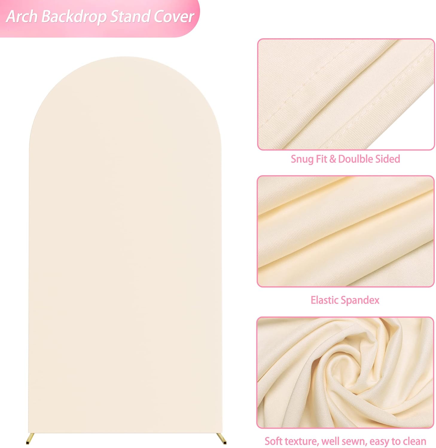 • 【Arch Backdrop Stand and Covers Package】Package contains 1pcs wedding arch stand and 1pcs arch cover. Size: 6.6x3.3ft(HxW). Material: metal arch backdrop stand and spandex arch cover. Color: Beige arch cover and gold wedding arch stand. Decorate your party with our gold arch stand and arch covers to create an epic decor for your celebration.